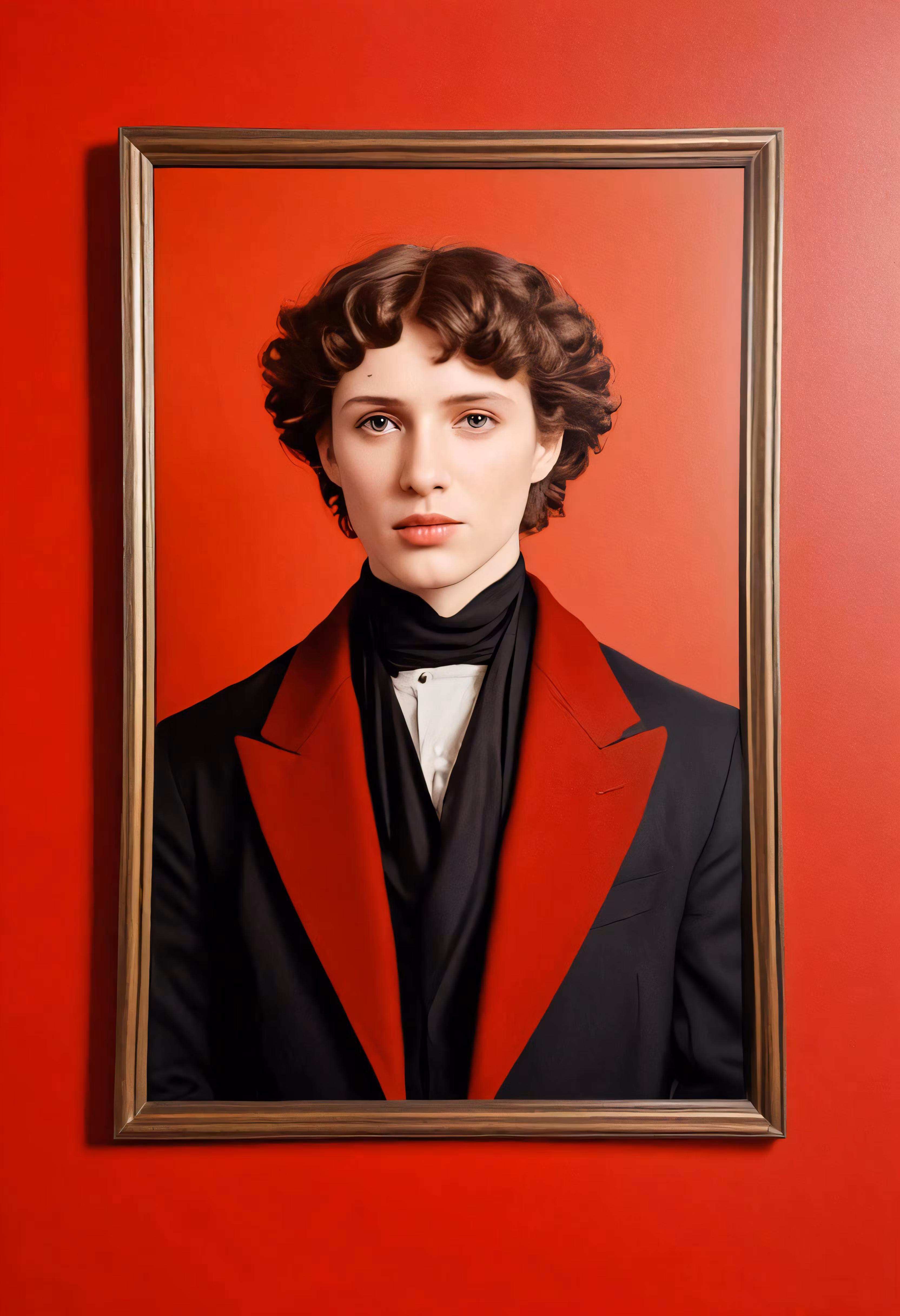 High resolution picture, free to use, the painting shows the portrait of a woman in a red jacket and bow tie