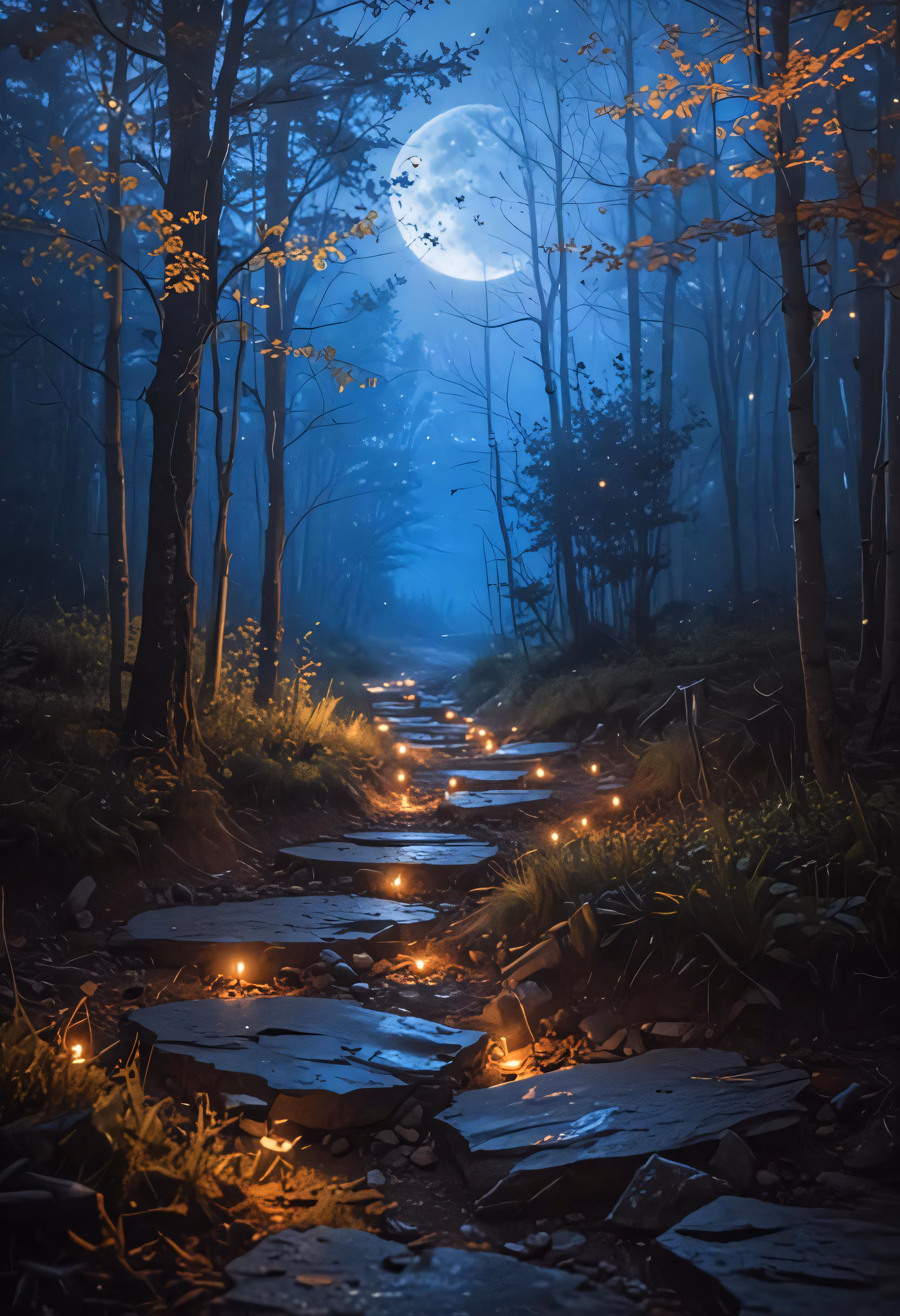 High resolution picture, free to use, the path in the forest has many lights shining on it