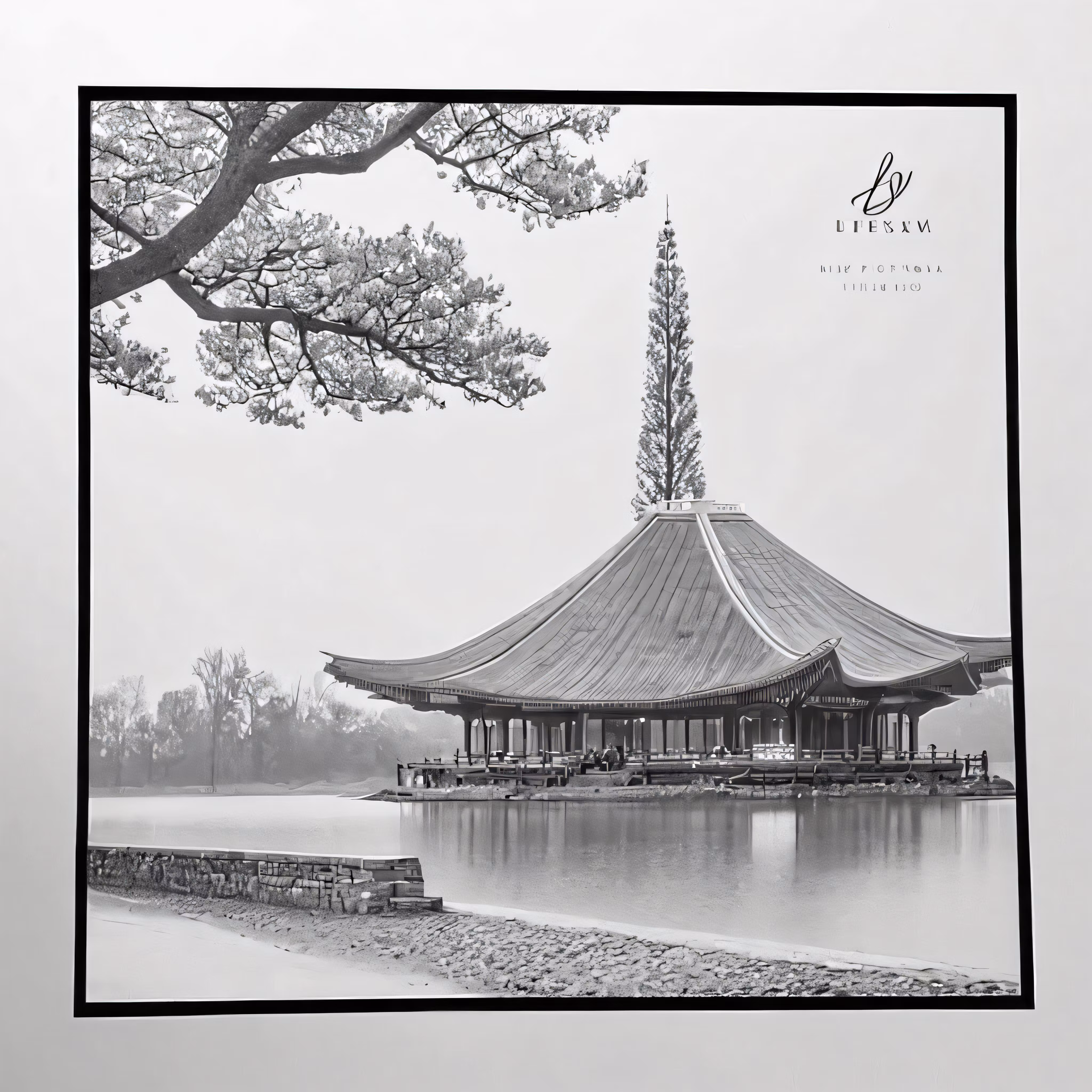 High resolution picture, free to use, the pavilion at the edge of a river on a foggy day