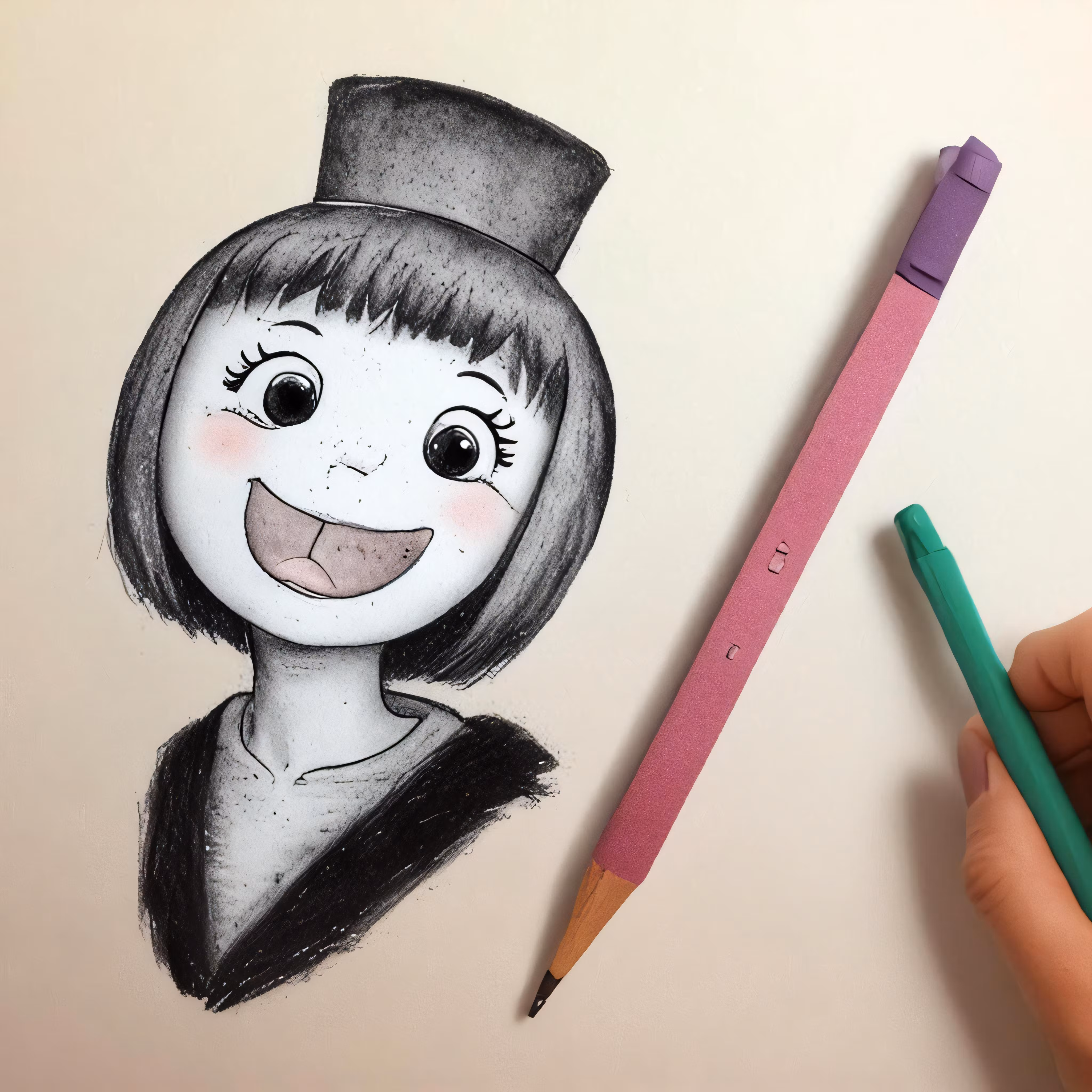 High resolution picture, free to use, the pencil is next to the drawing of an adorable woman