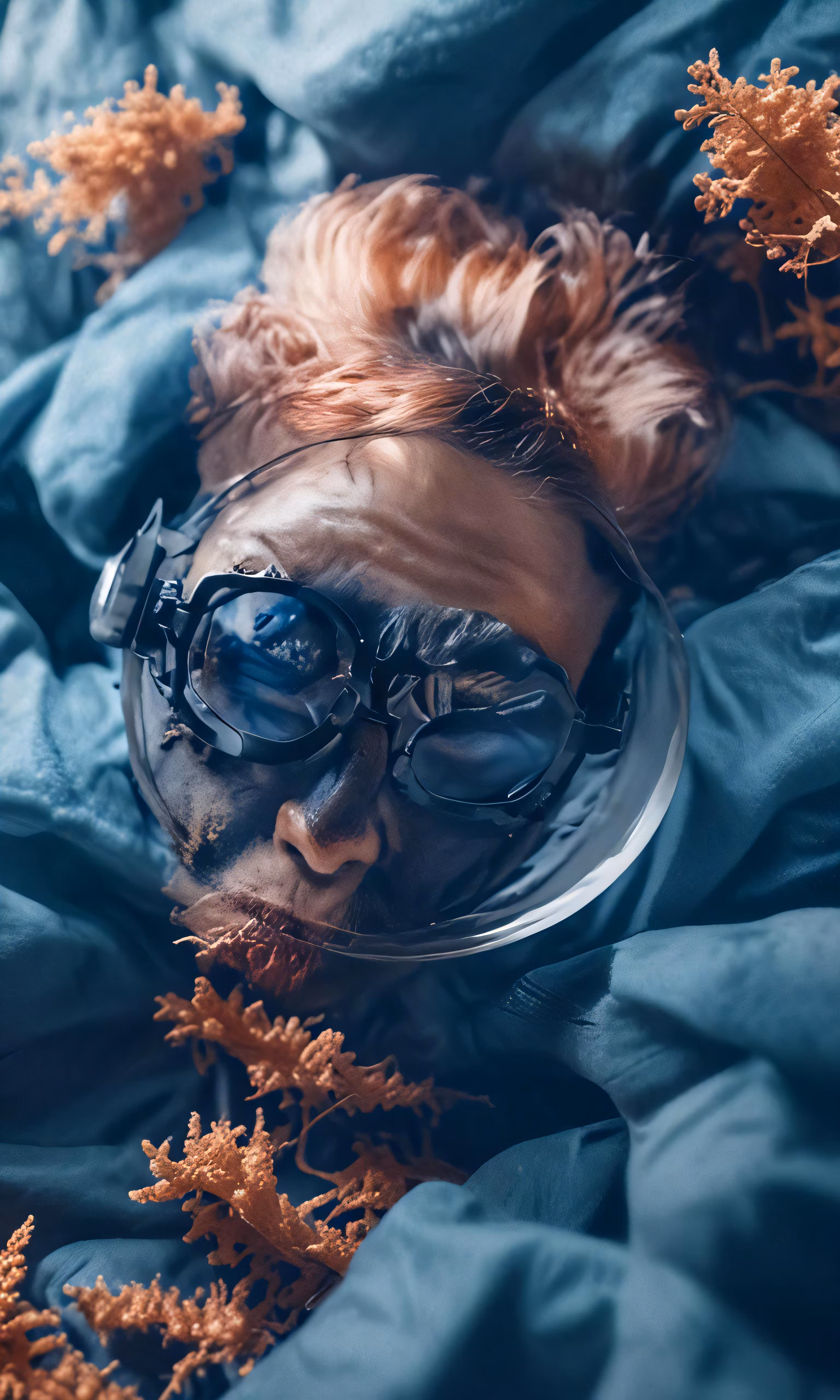 High resolution picture, free to use, the person is lying down wearing goggles and blue shirt
