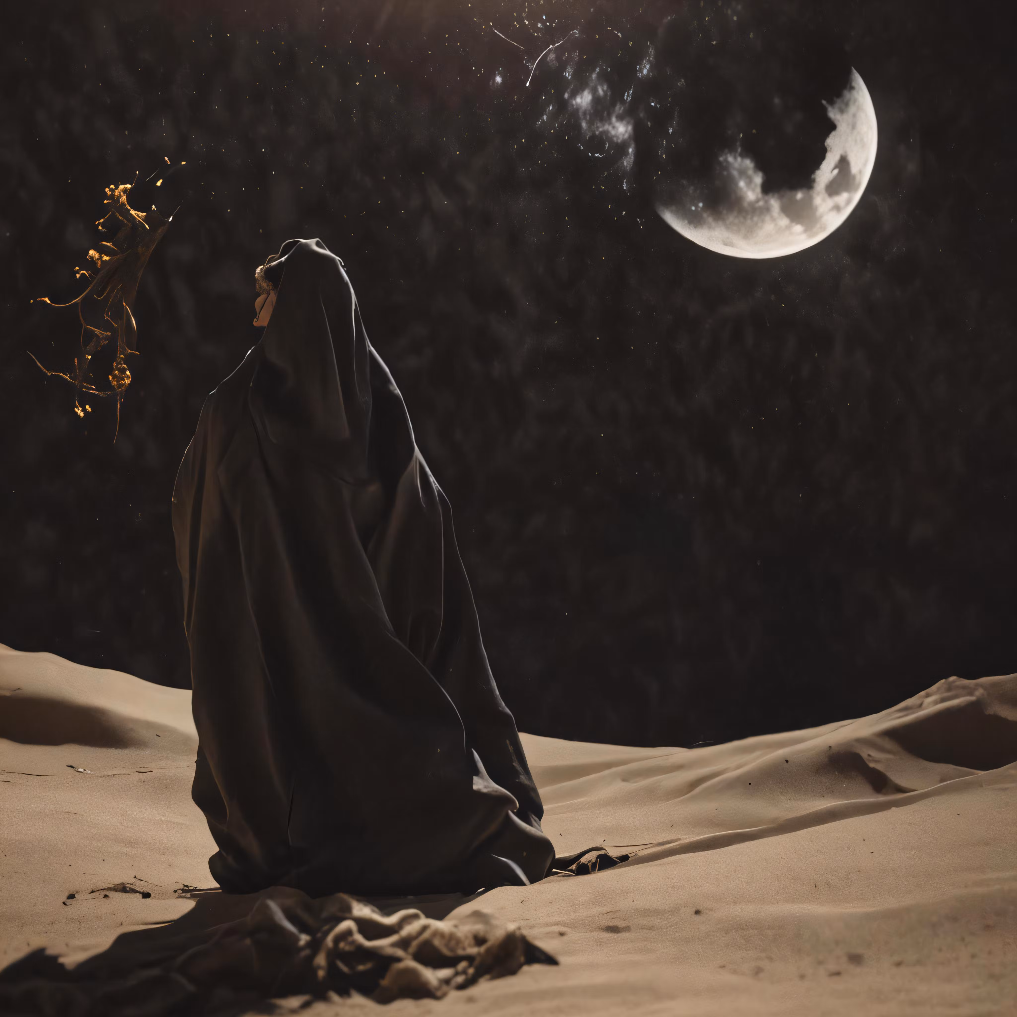 High resolution picture, free to use, the person sits in the desert in front of a moon