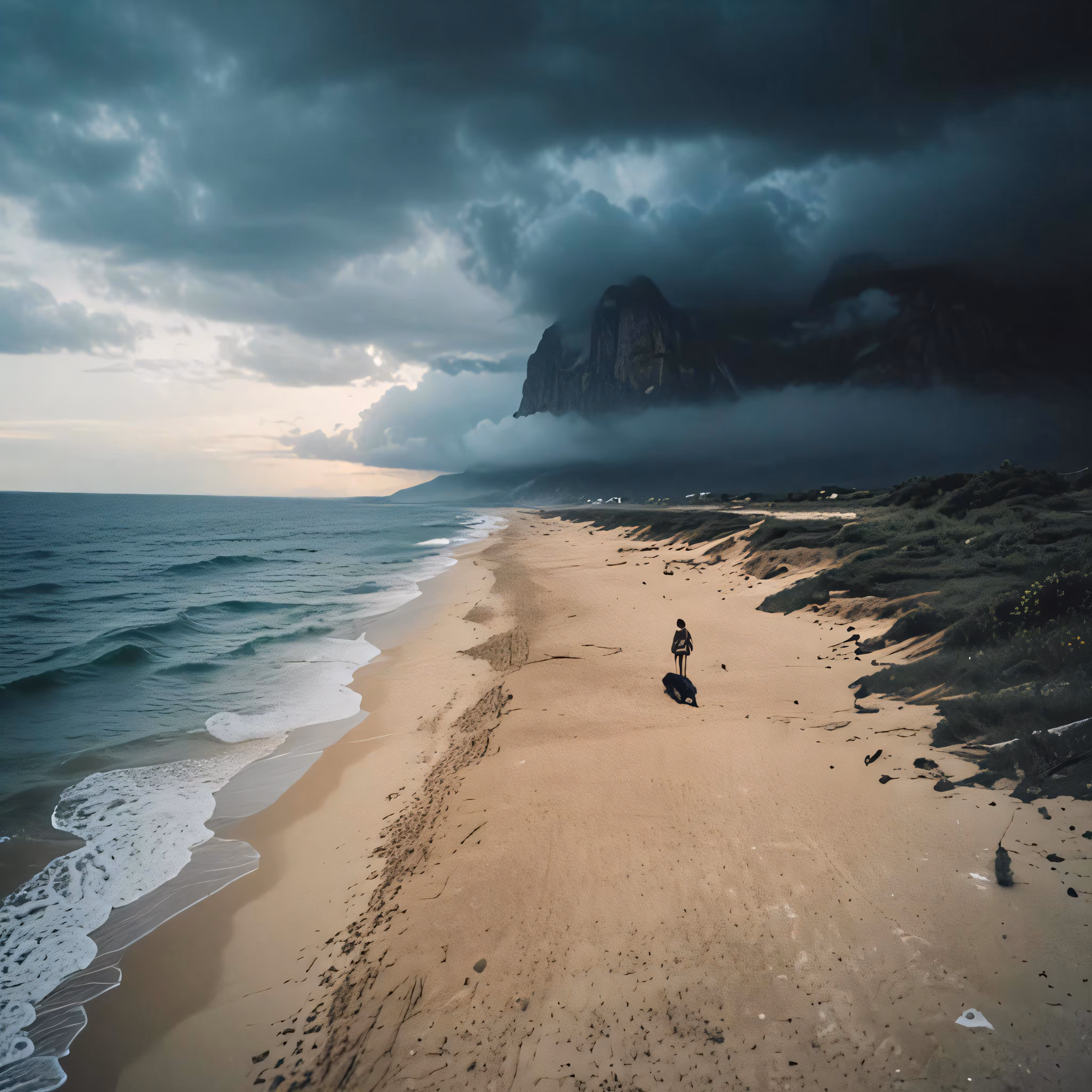 High resolution picture, free to use, the person walks alone on the sandy beach with a dark sky