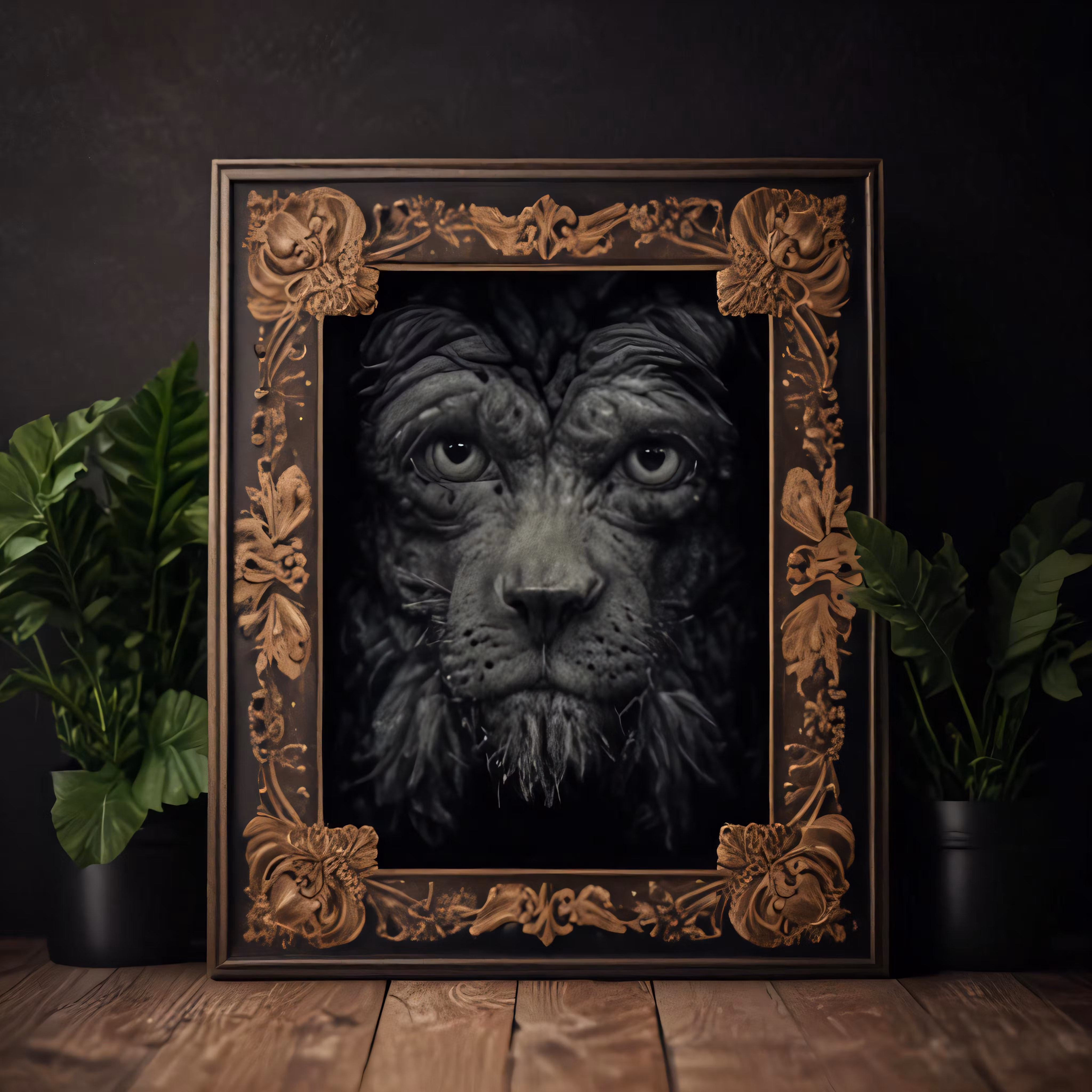 High resolution picture, free to use, the photograph has a black and gold frame in front of a wooden table