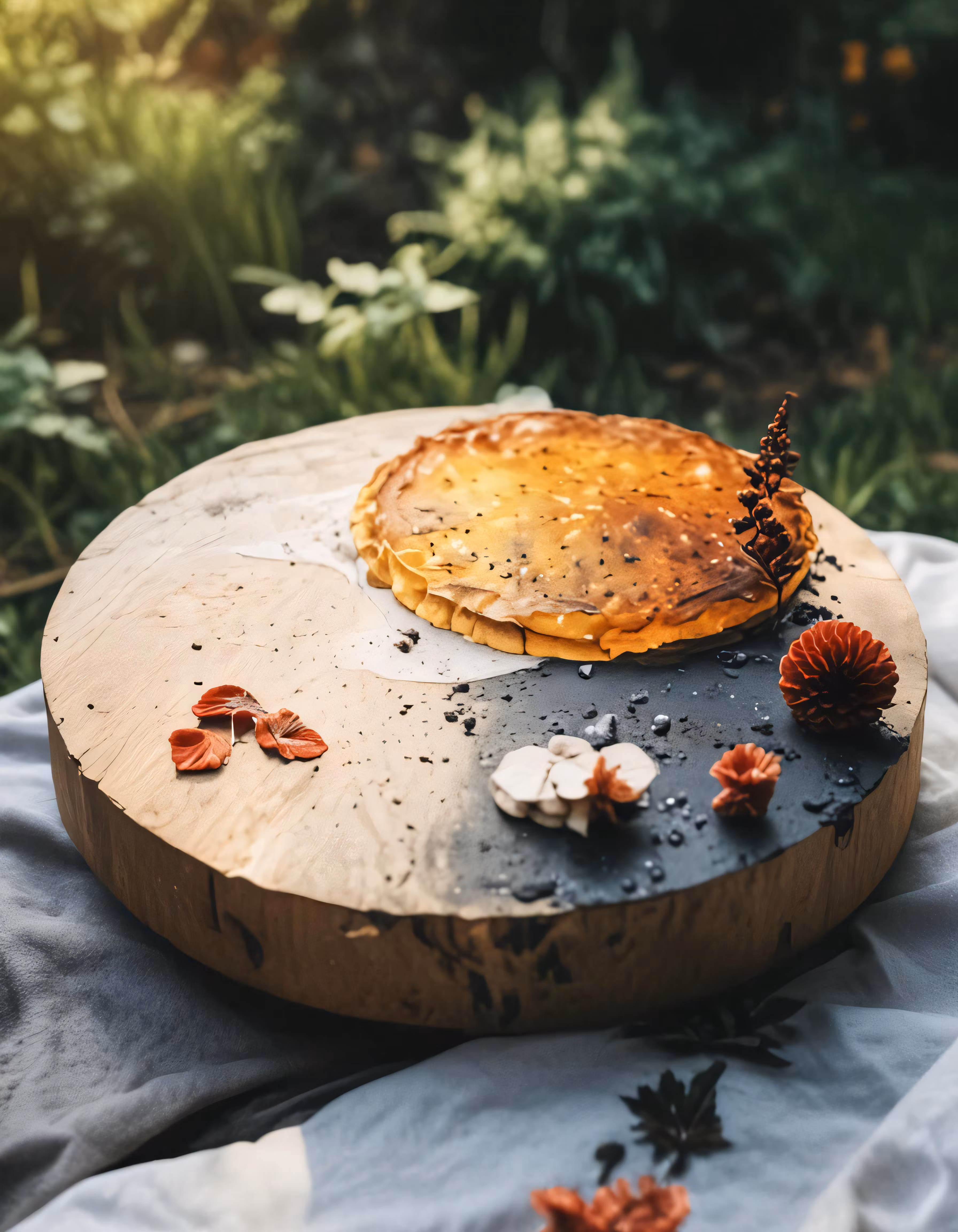 High resolution picture, free to use, the pie has flowers all over it on the round wooden table