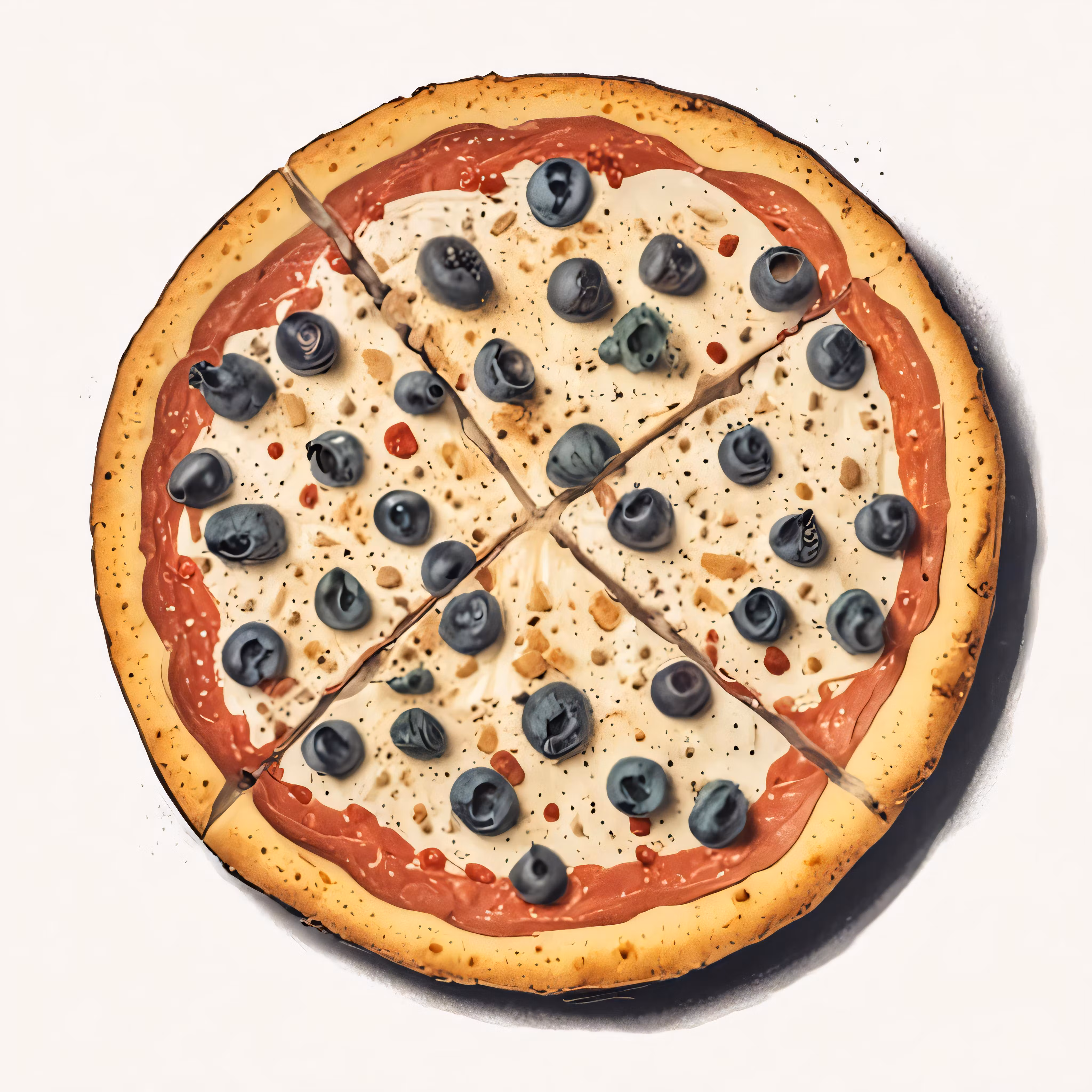 High resolution picture, free to use, the pizza is covered with blue berries and has a piece taken out