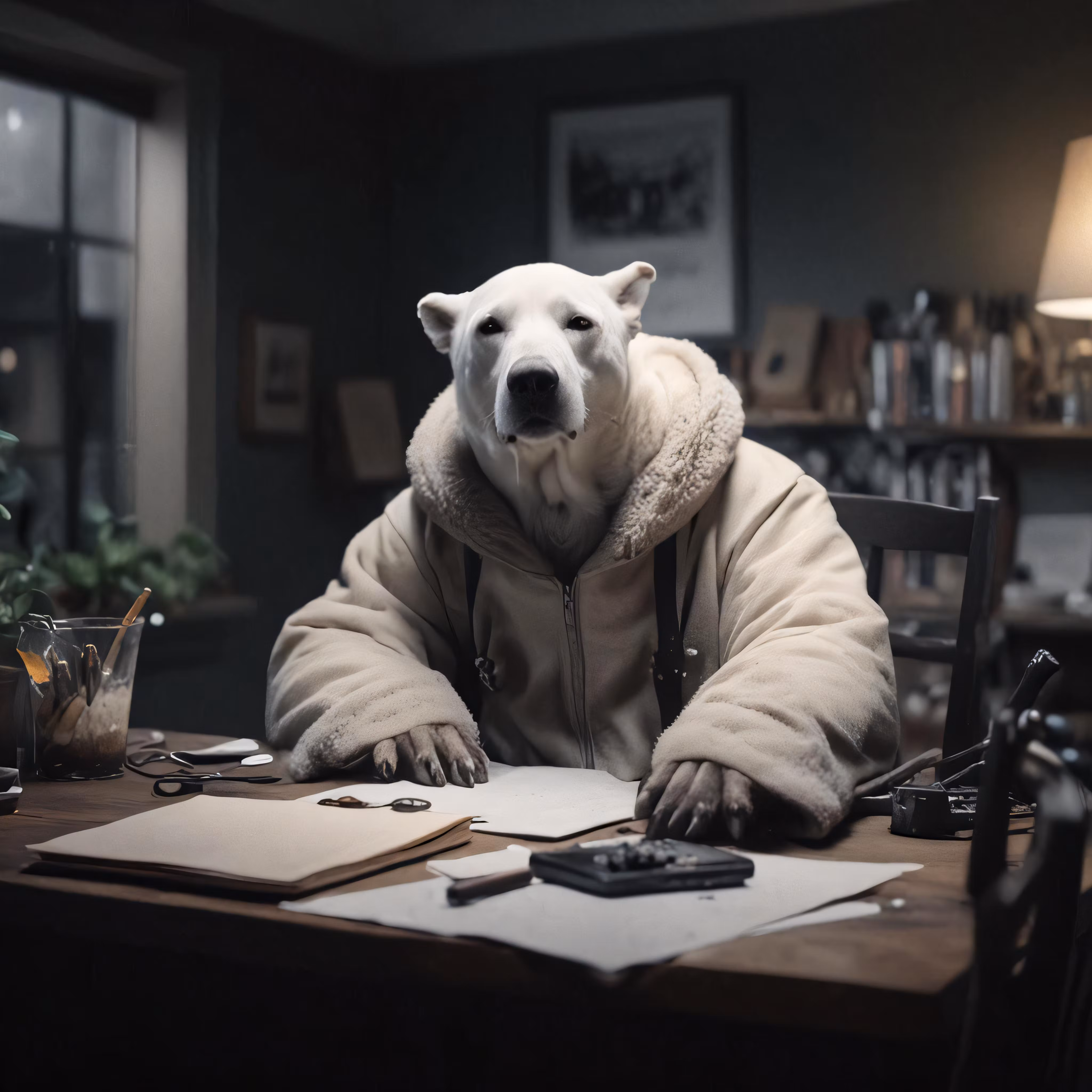 High resolution picture, free to use, the polar bear is sitting at a desk