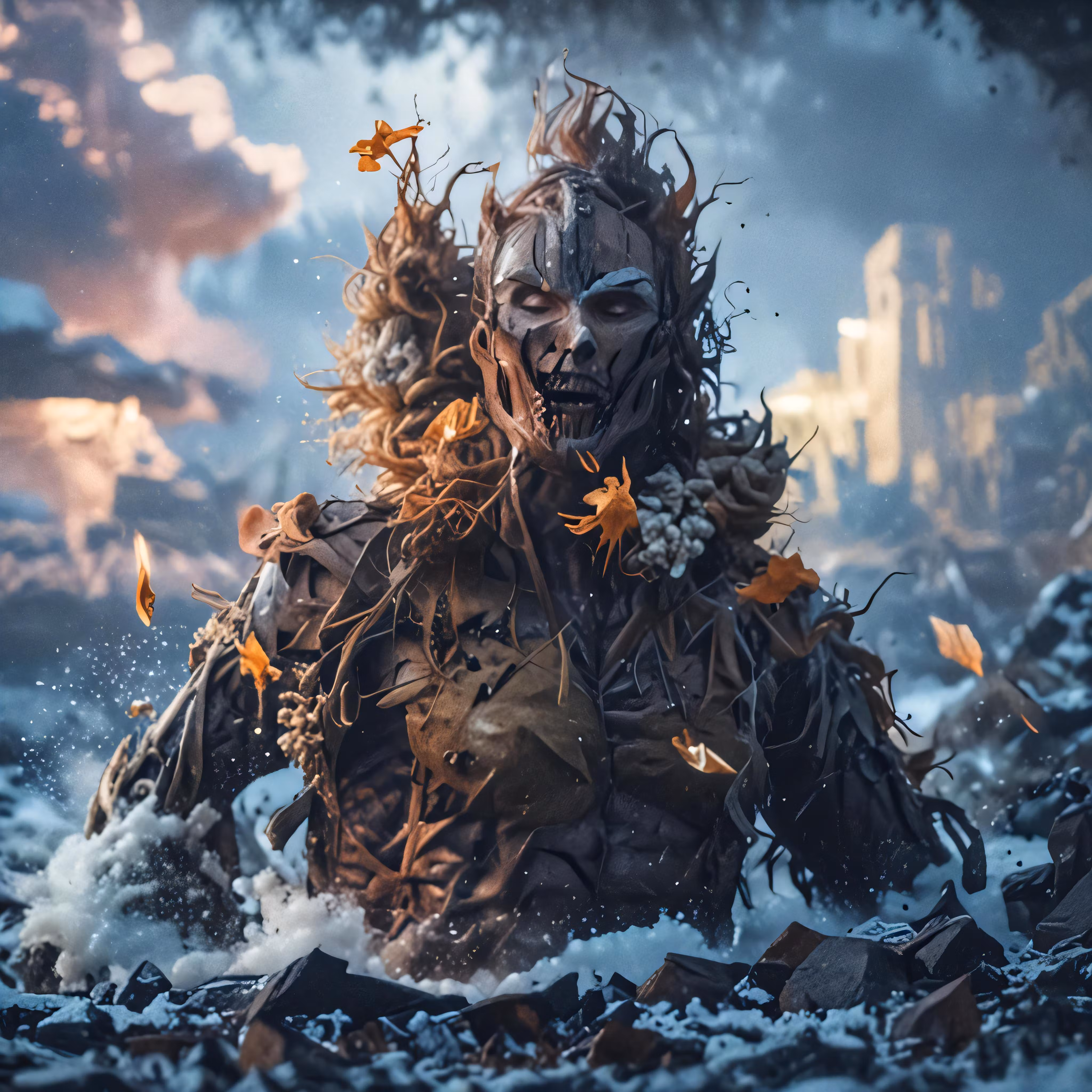 High resolution picture, free to use, the predator artwork has a human face surrounded by leaves and rocks