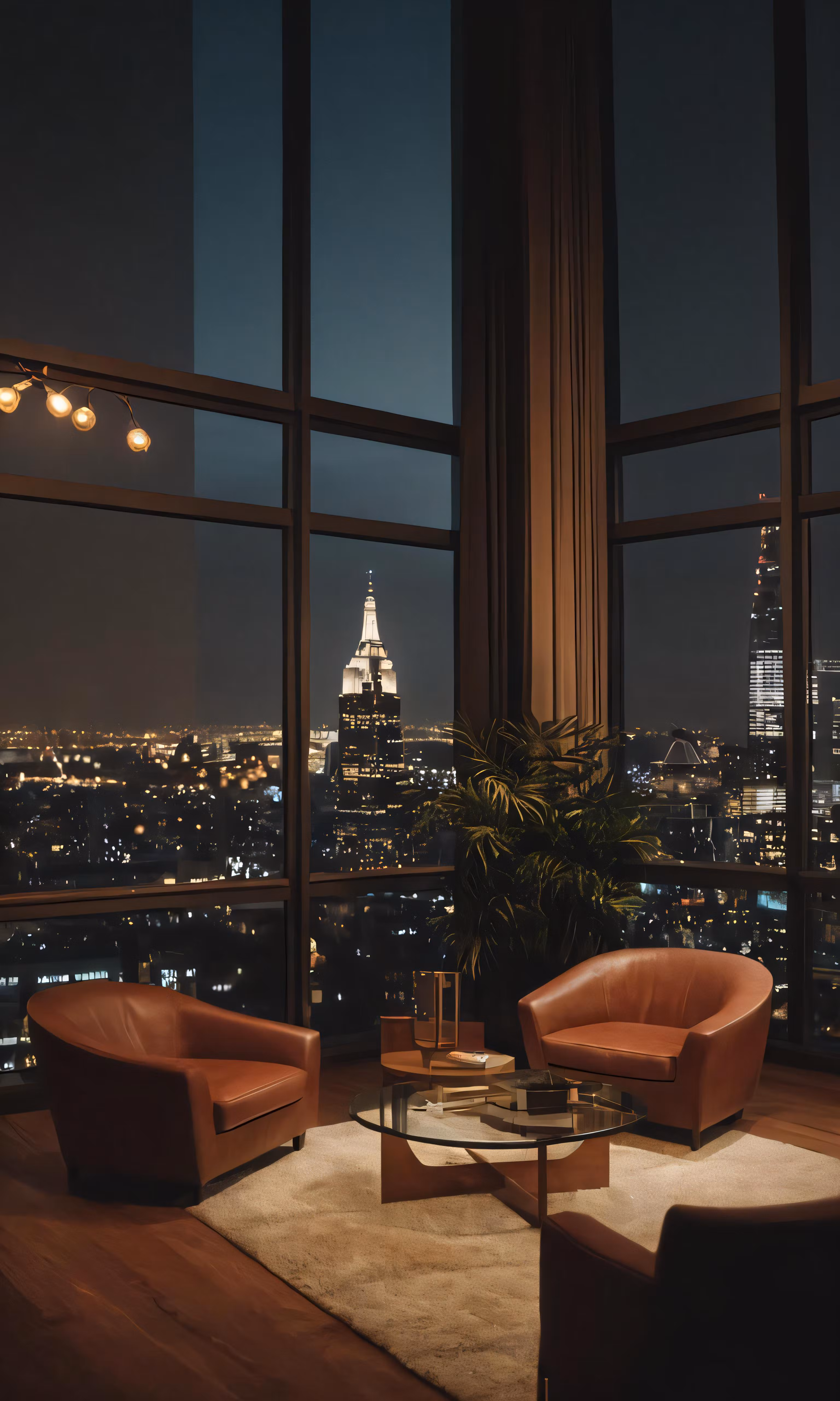High resolution picture, free to use, the room is full of high tech furniture with city lights visible outside the windows