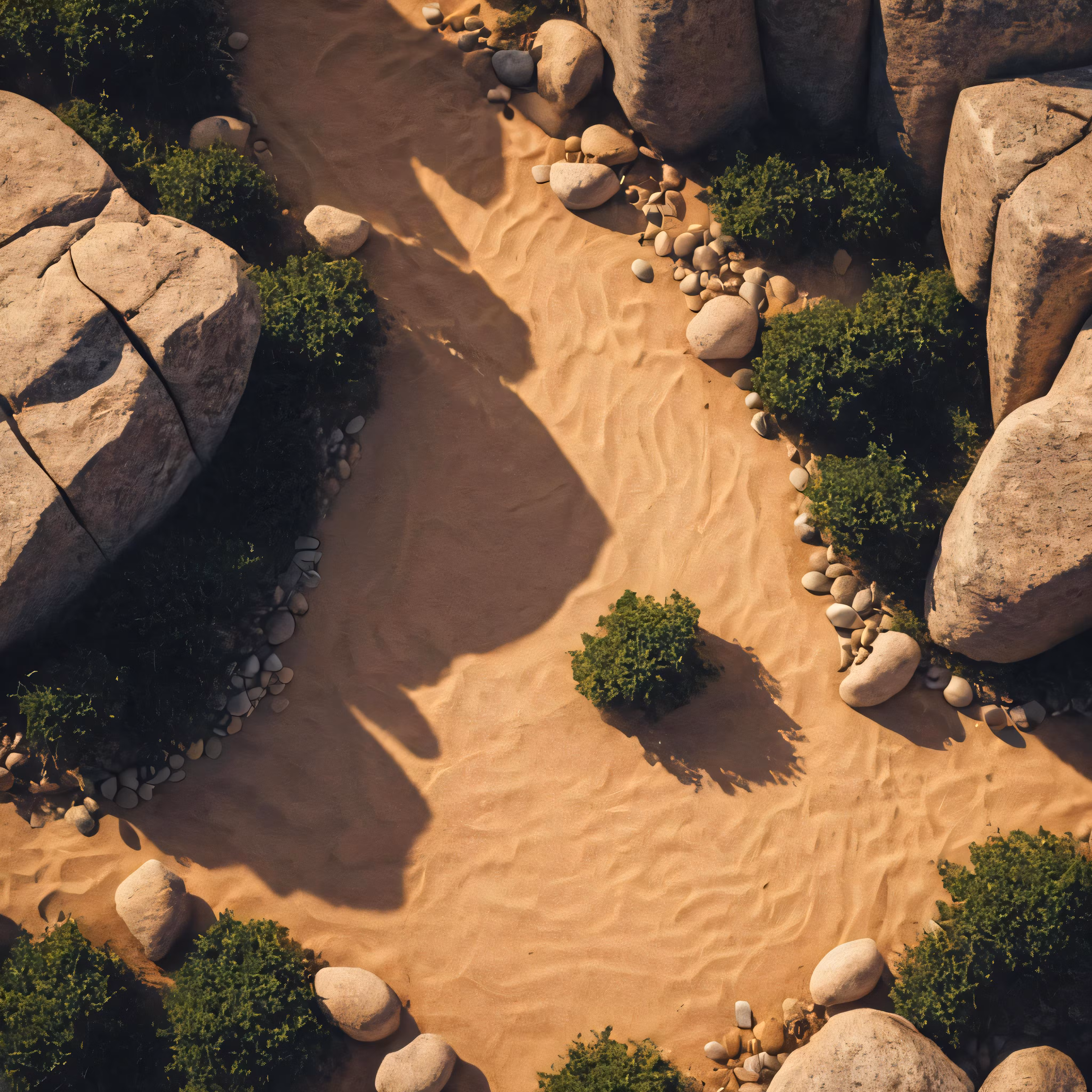 High resolution picture, free to use, the sand is covered with rocks, stones and green bushes