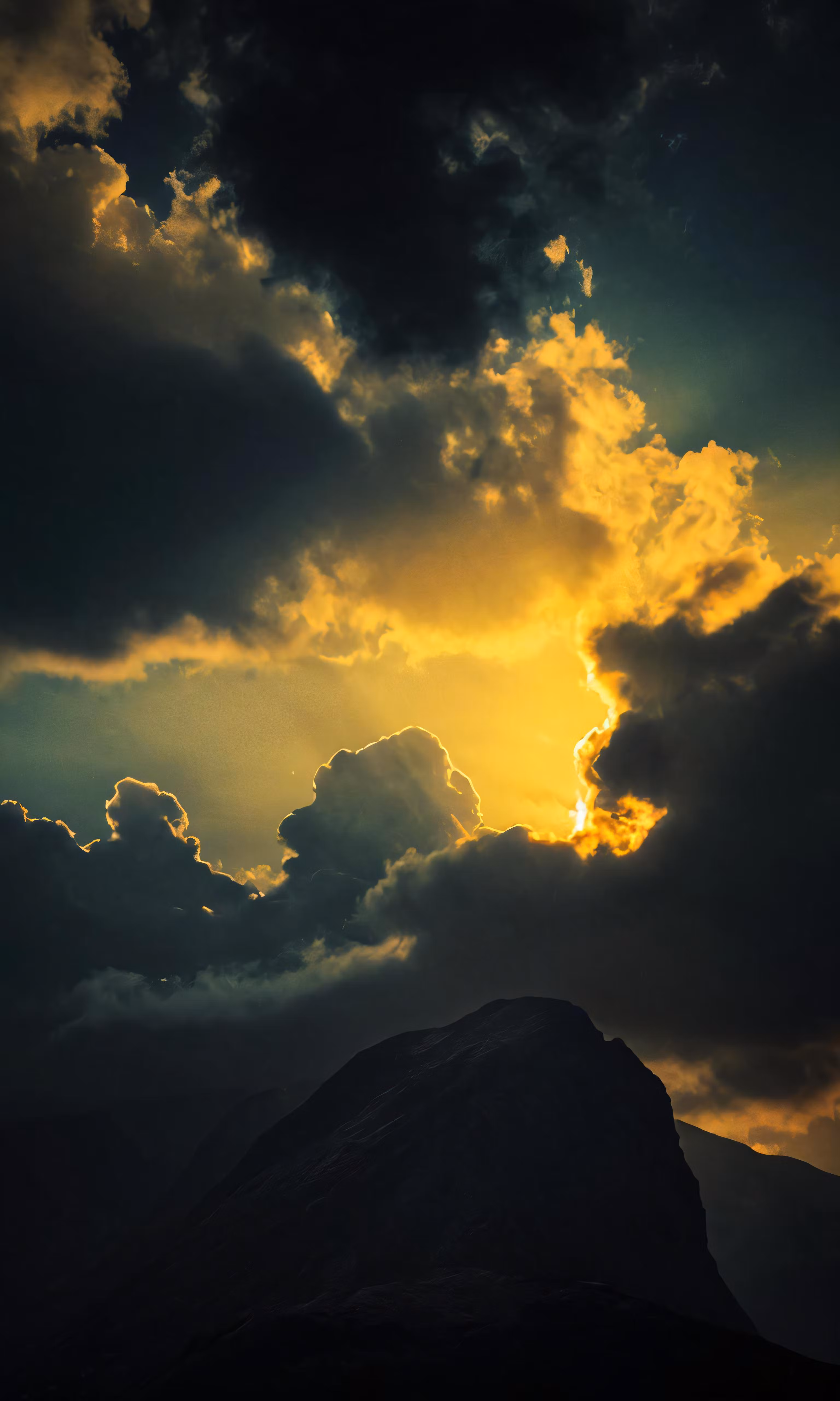 High resolution picture, free to use, the setting sun shines through cloud covers on a mountain