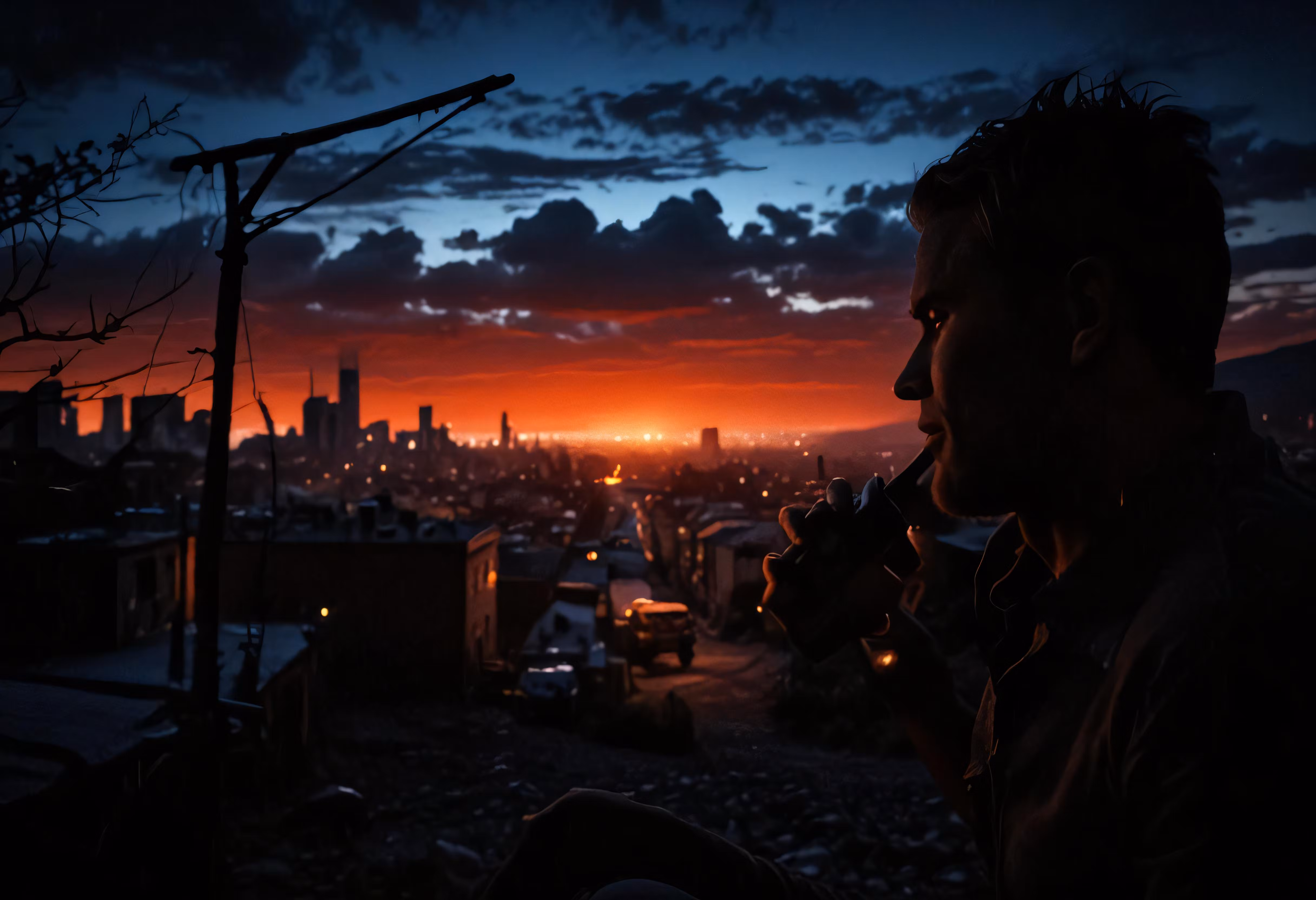 High resolution picture, free to use, the sky is red and dark while a man in leathers watches