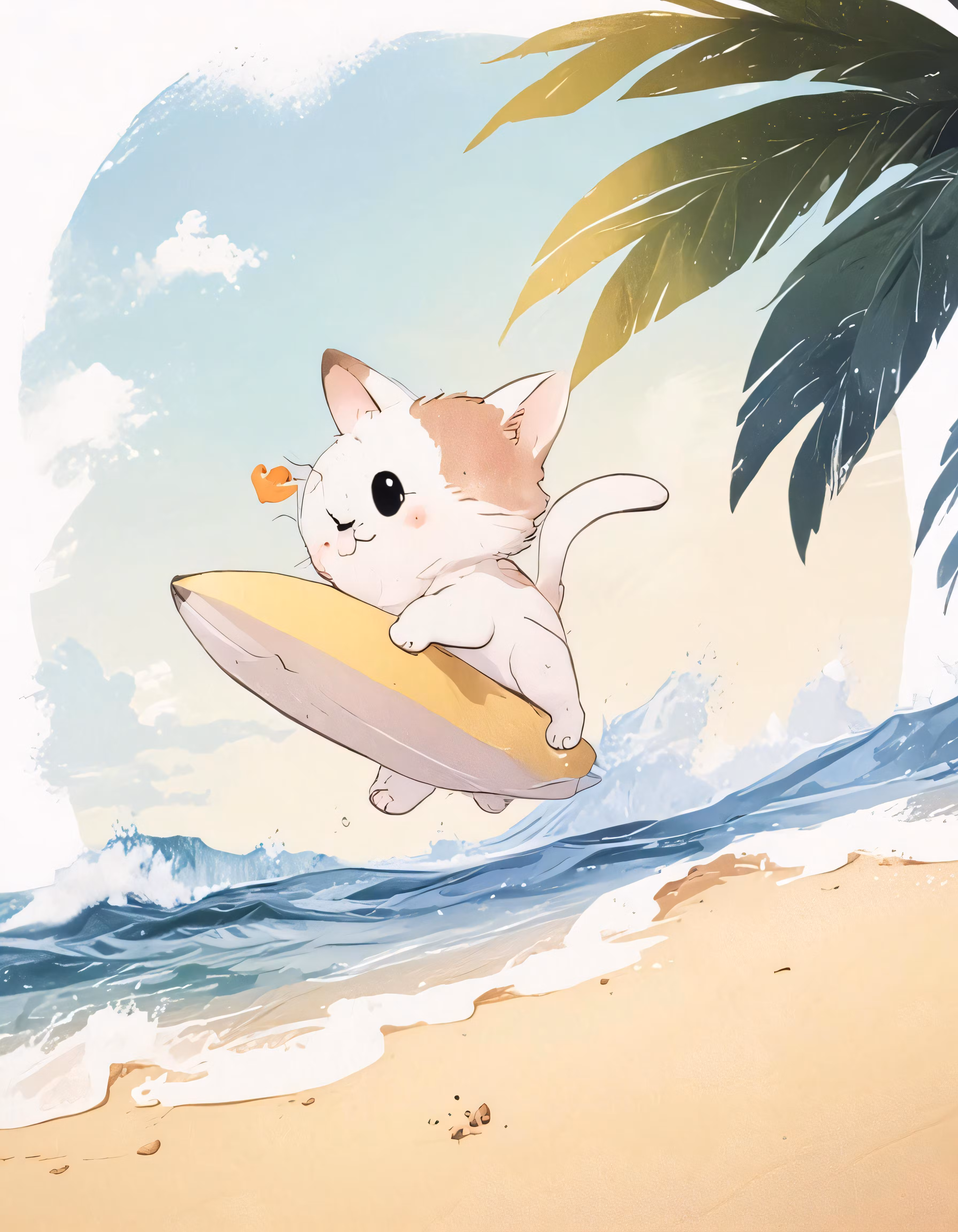 High resolution picture, free to use, the small kitten is jumping through the air on top of a surfboard