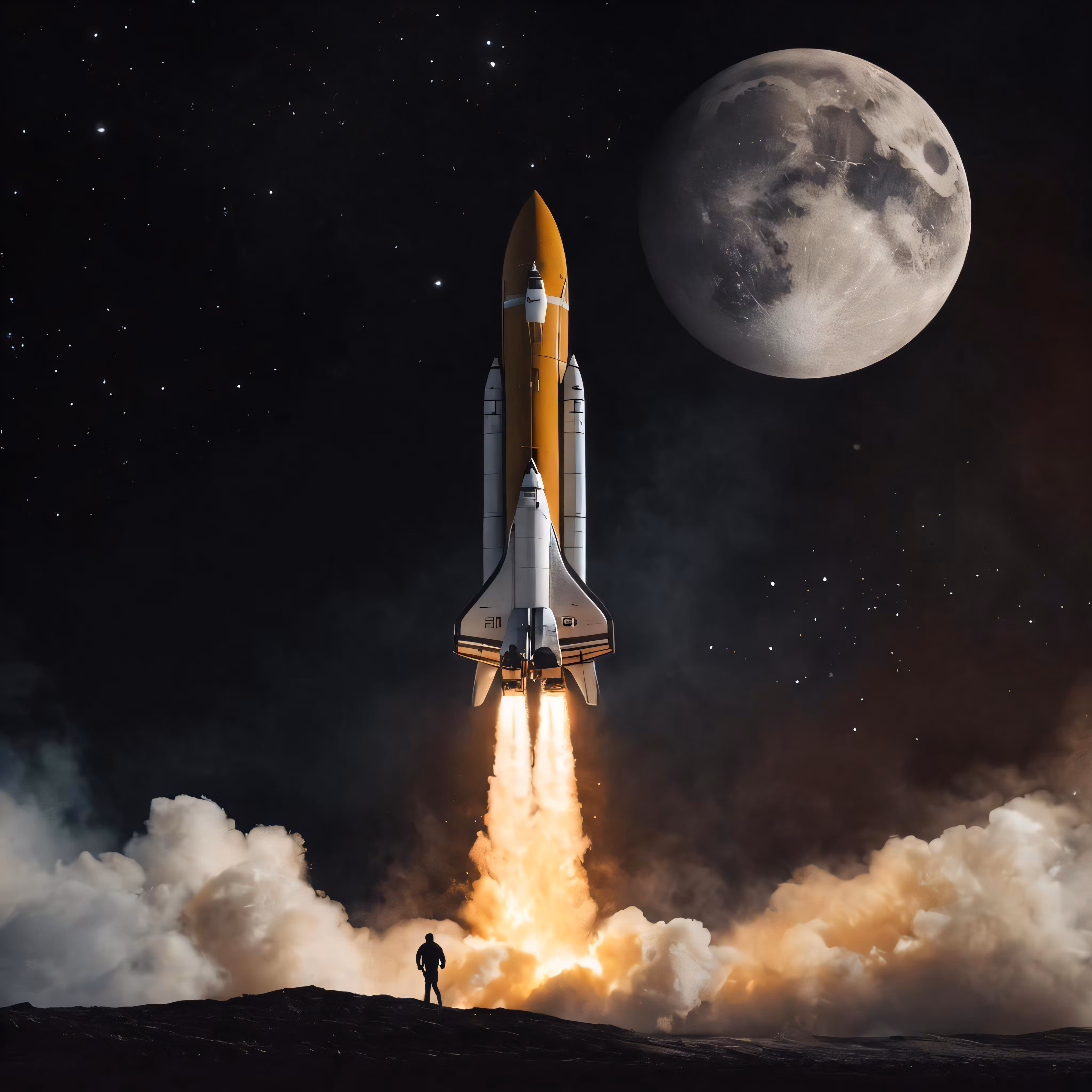 High resolution picture, free to use, the space shuttle is being launched from earth on a full moonlit night