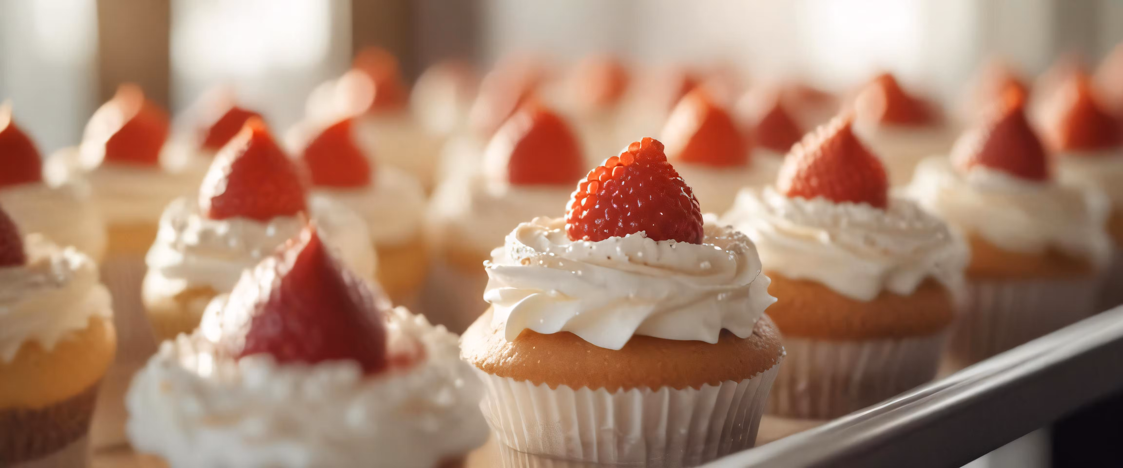 High resolution picture, free to use, the strawberry cupcakes have whipped cream on top of them