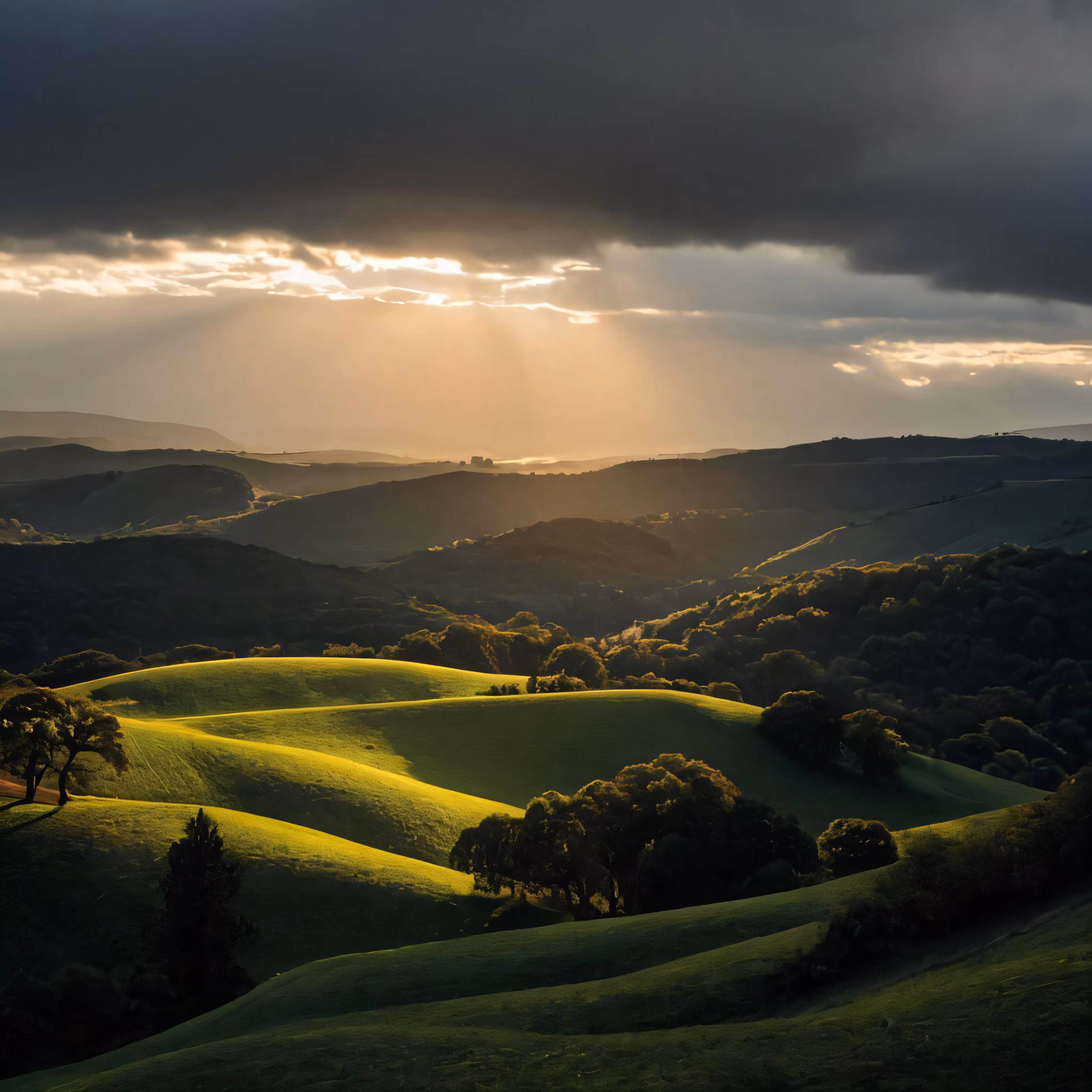 High resolution picture, free to use, the sun breaking through some dark clouds over rolling hills