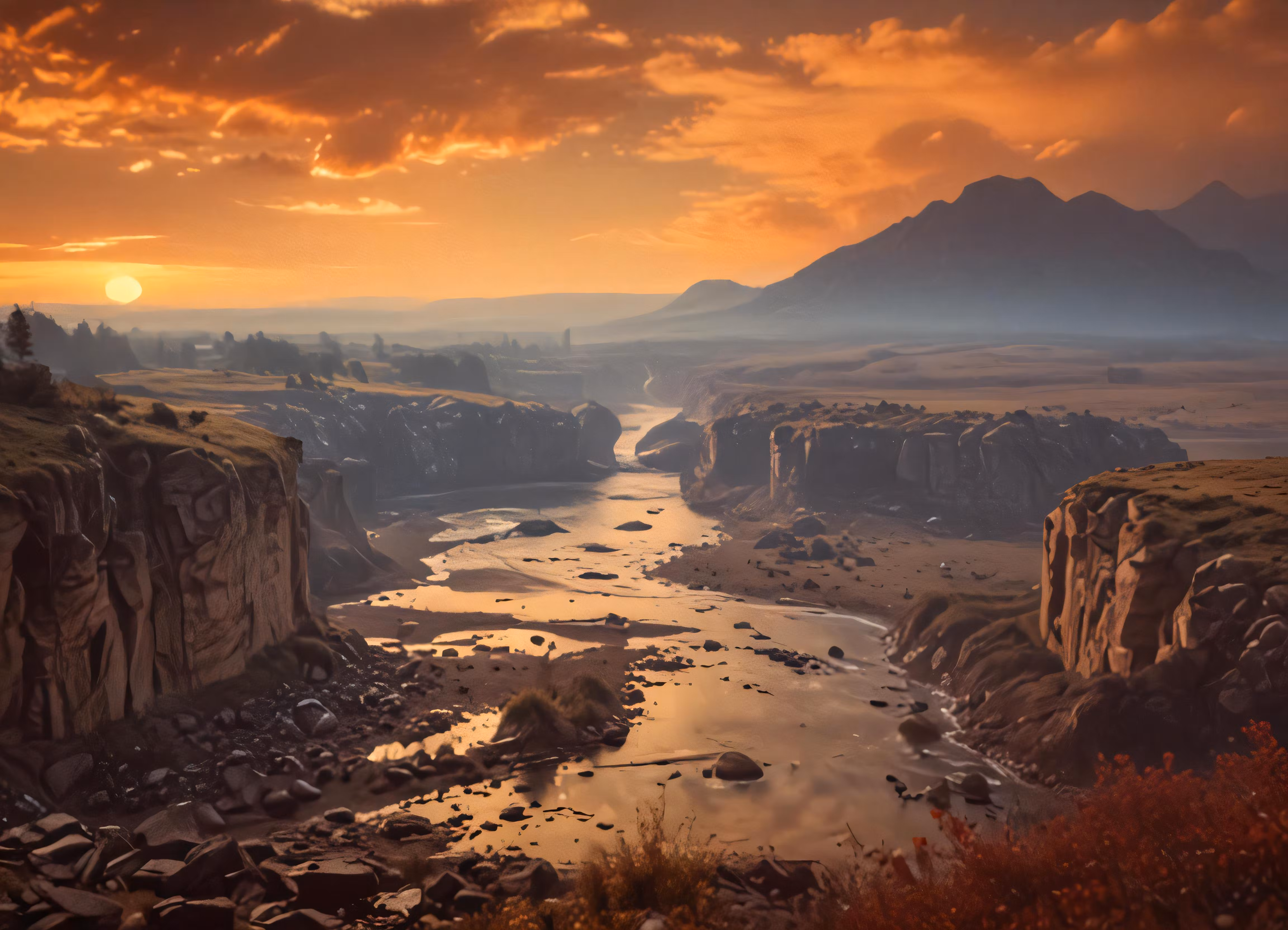 High resolution picture, free to use, the sun is rising over a large river