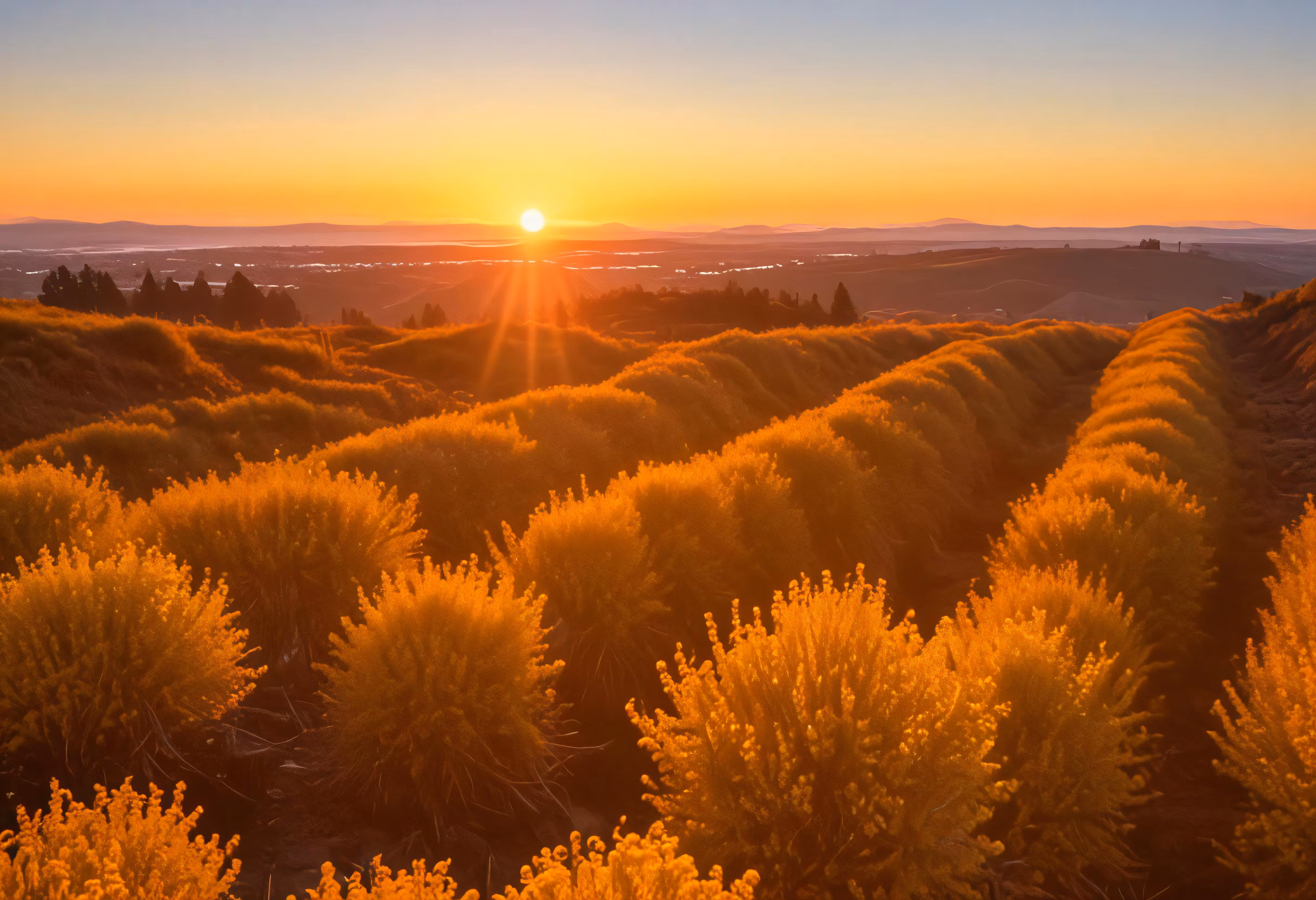 High resolution picture, free to use, the sun is setting over a hilly valley