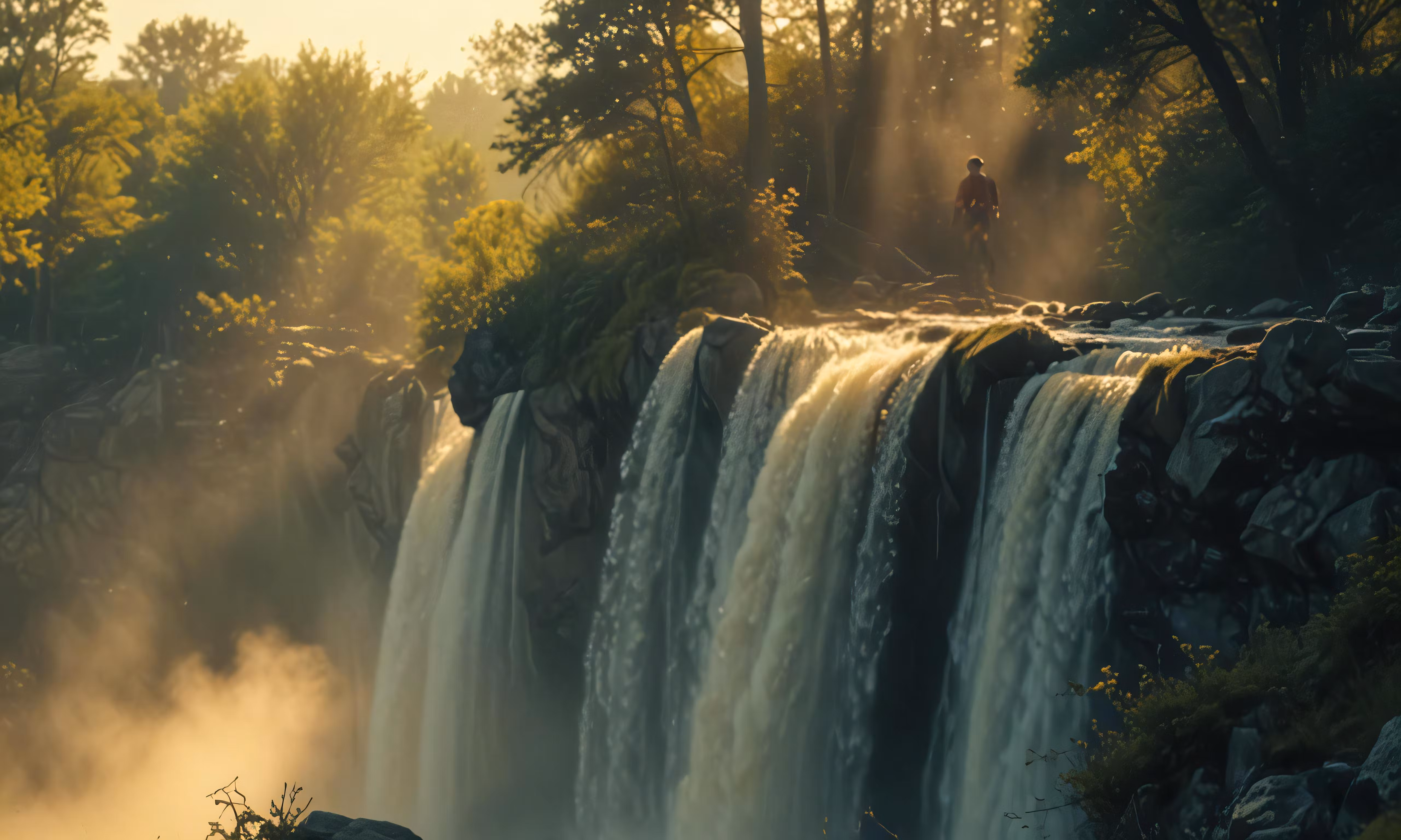 High resolution picture, free to use, the sun is shining on a waterfall with mist