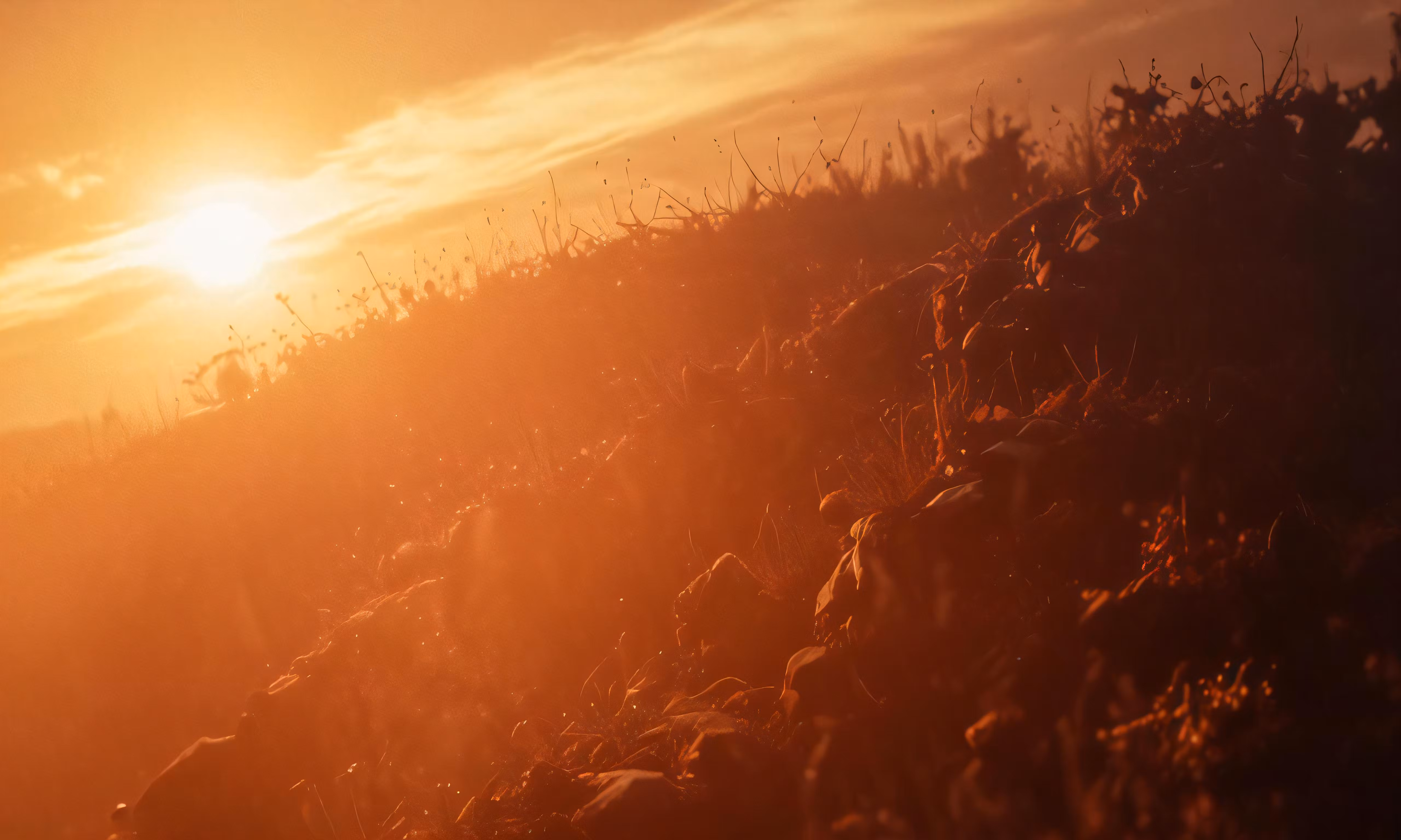 High resolution picture, free to use, the sun rising over a hillside next to some weeds