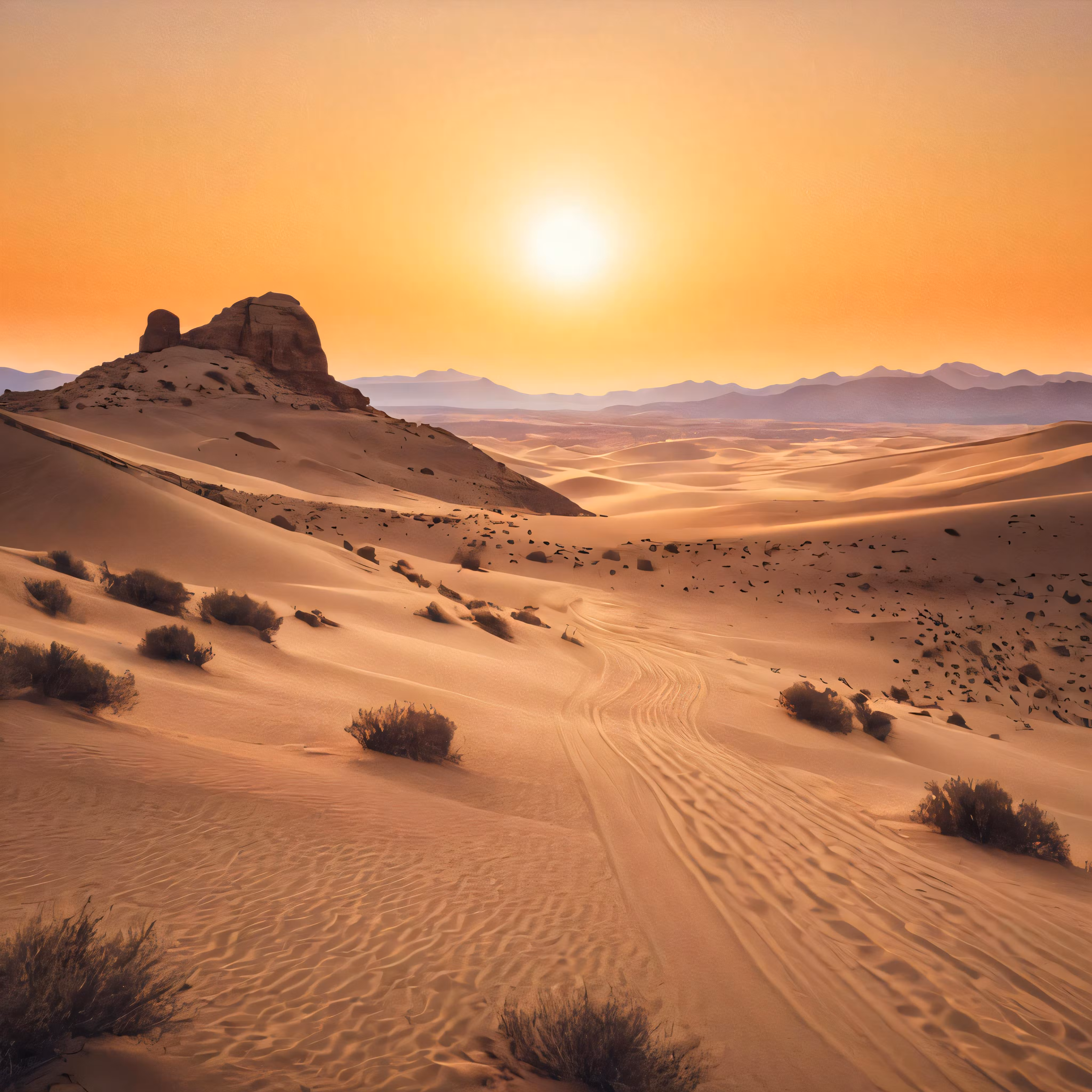 High resolution picture, free to use, the sun sets over a desert with sand dunes and trees