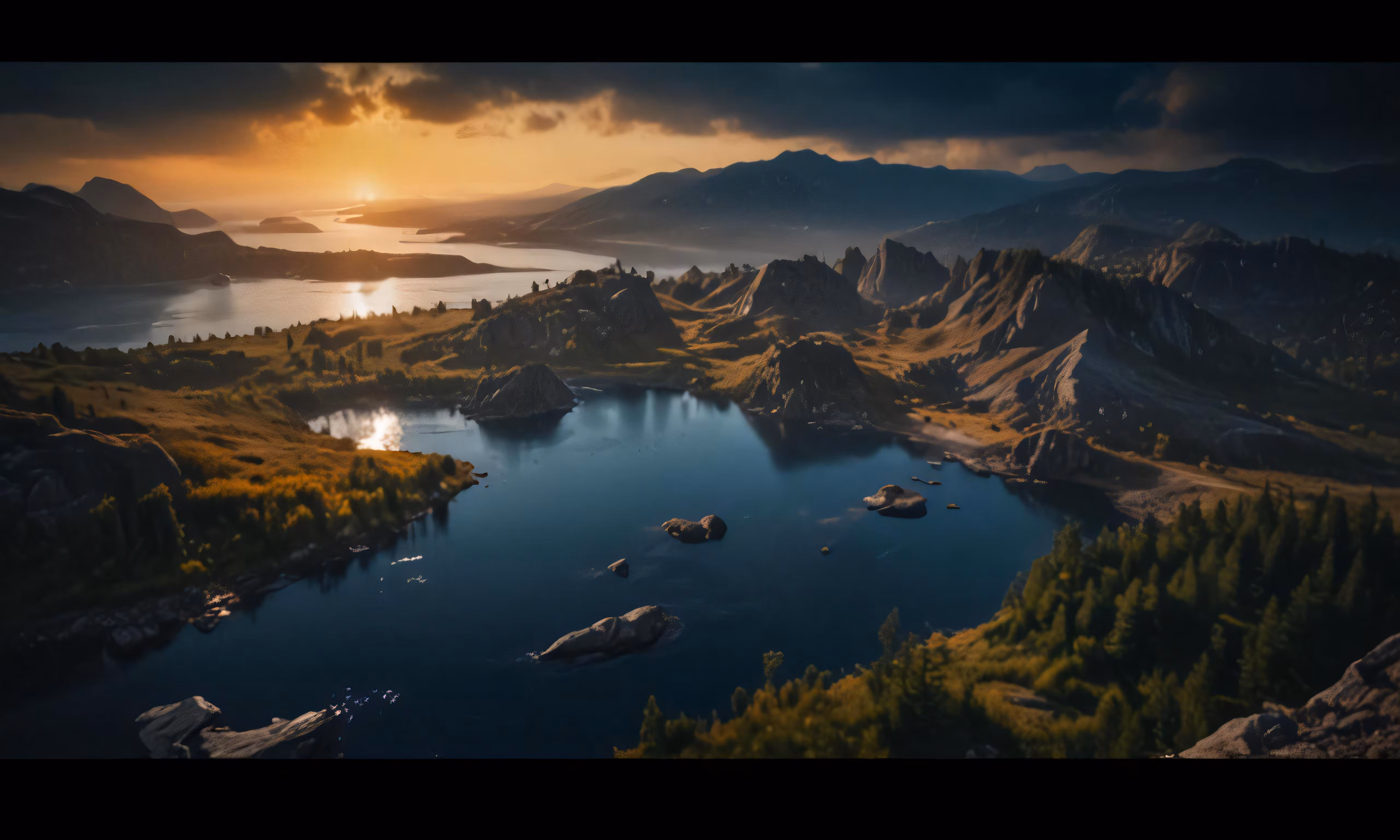 High resolution picture, free to use, the sun sets over a mountain and lake