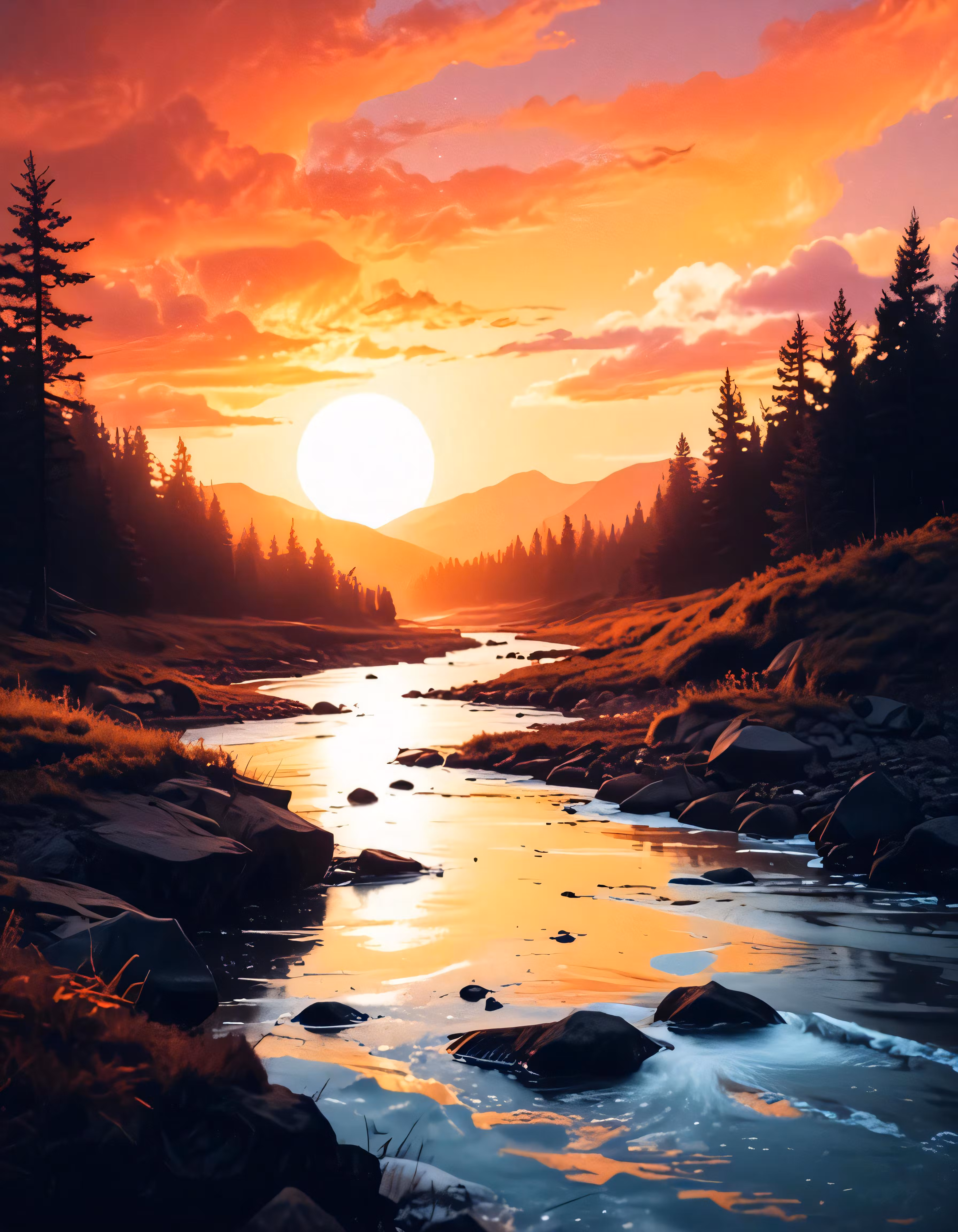 High resolution picture, free to use, the sun sets over the mountains and the stream
