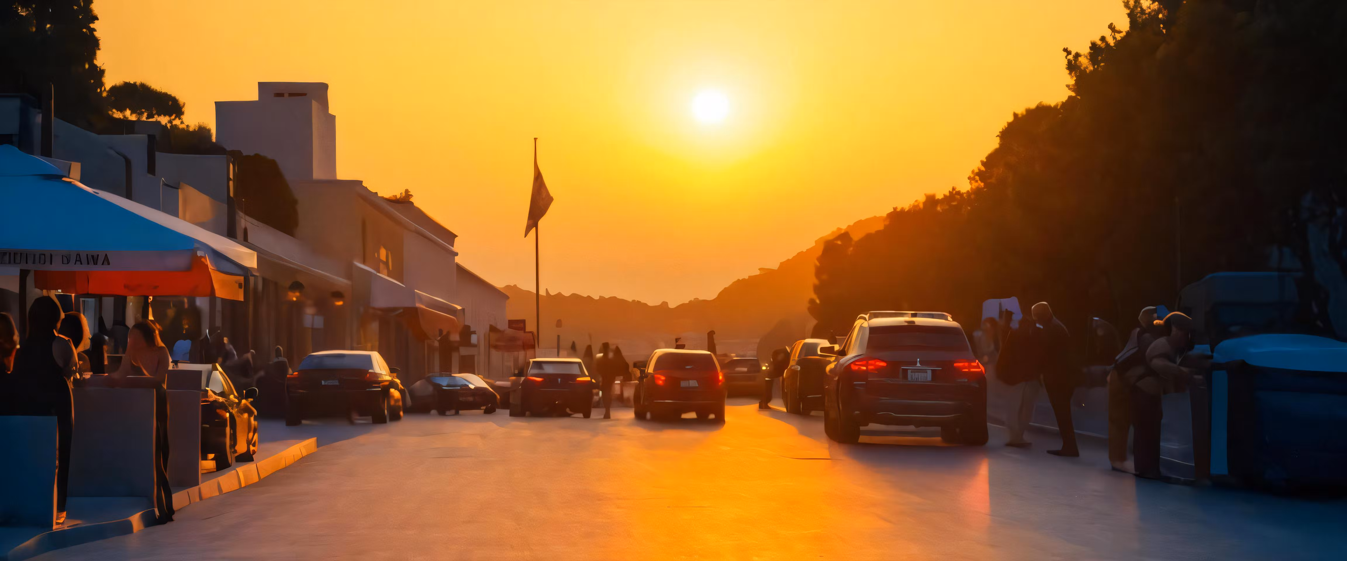 High resolution picture, free to use, the sun setting behind the city buildings on a busy street