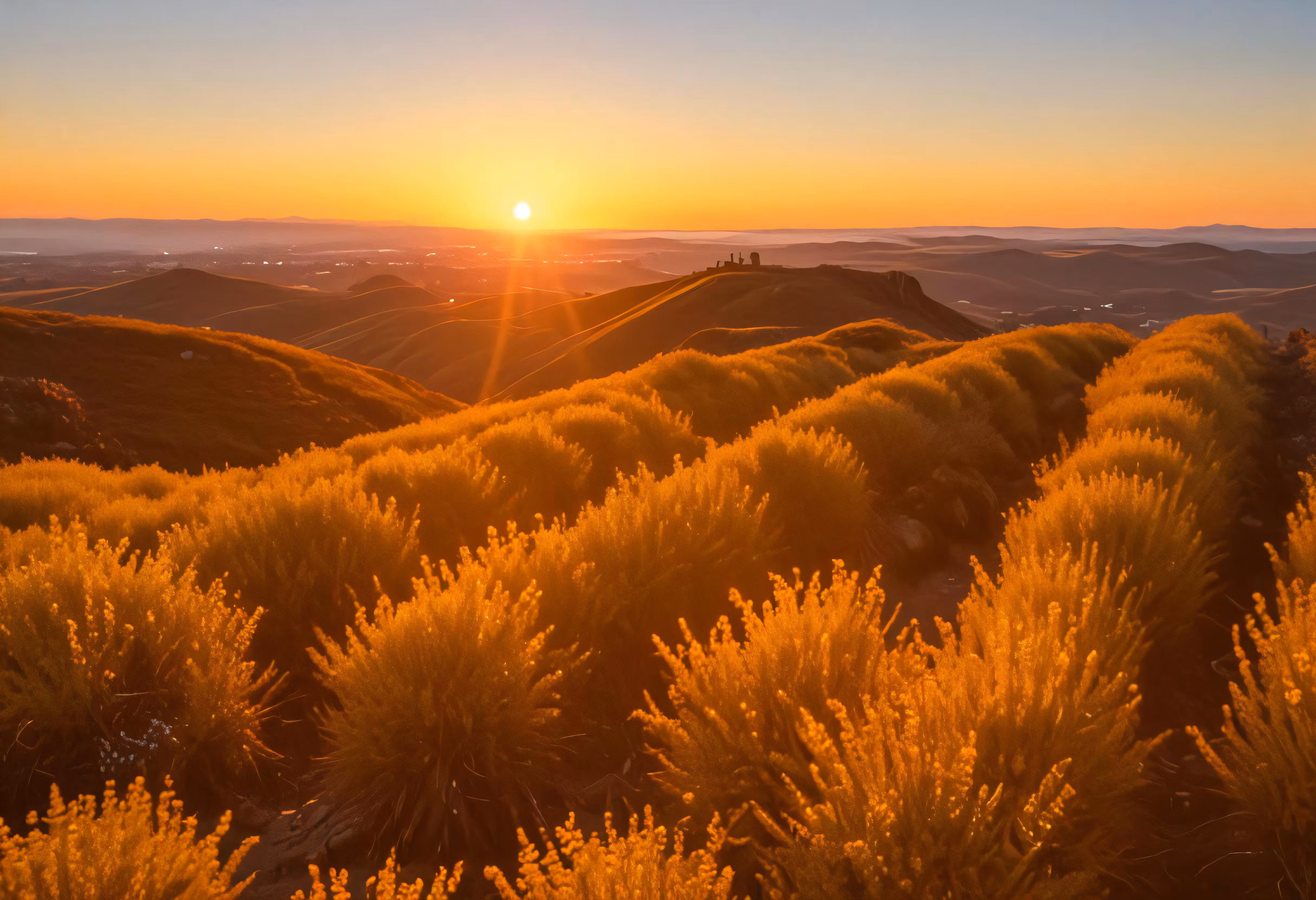High resolution picture, free to use, the sun setting in the background, over some grass and hills