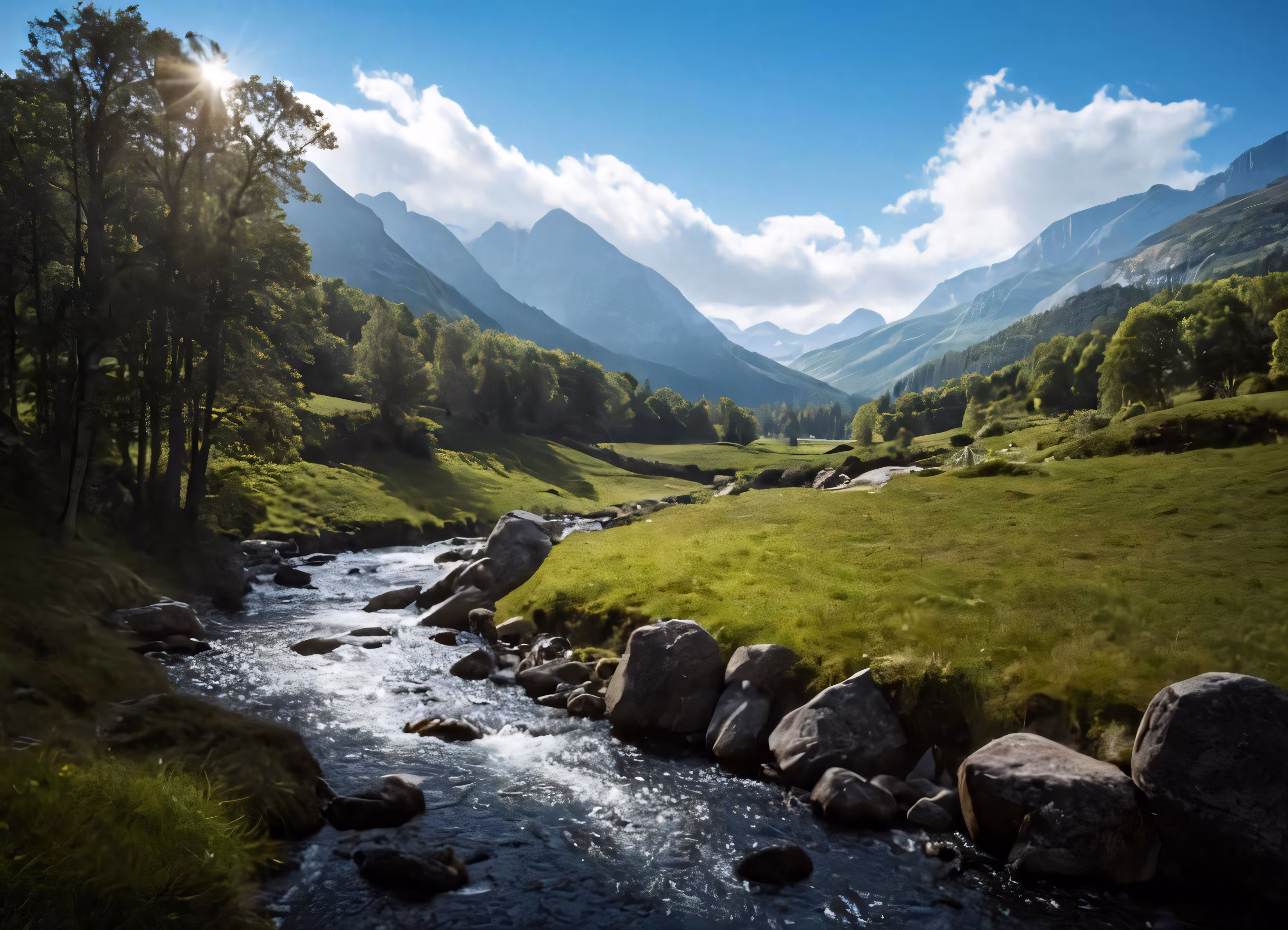 High resolution picture, free to use, the sun shines brightly on a valley with green vegetation and rocks