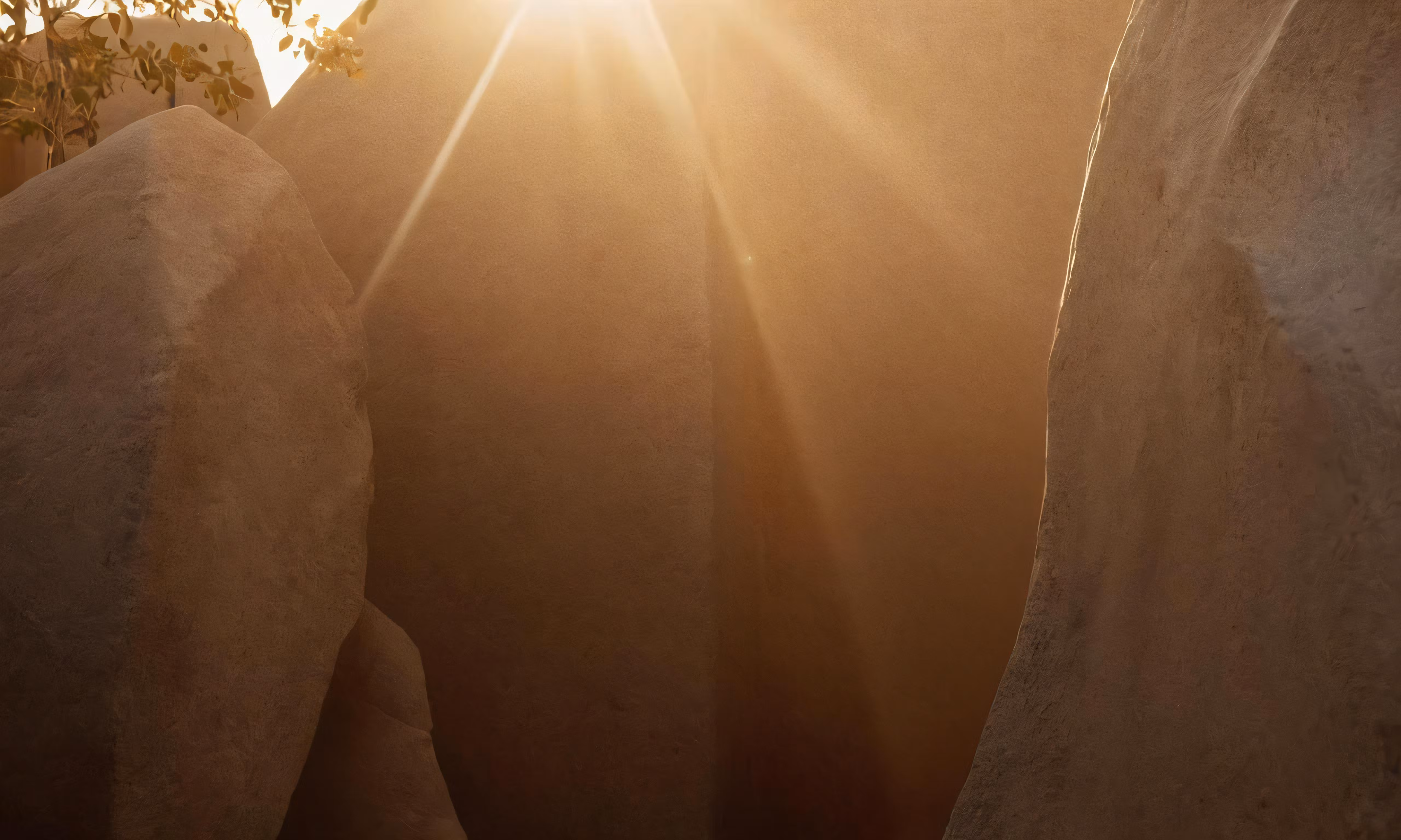 High resolution picture, free to use, the sun shining over some rocks and a tree