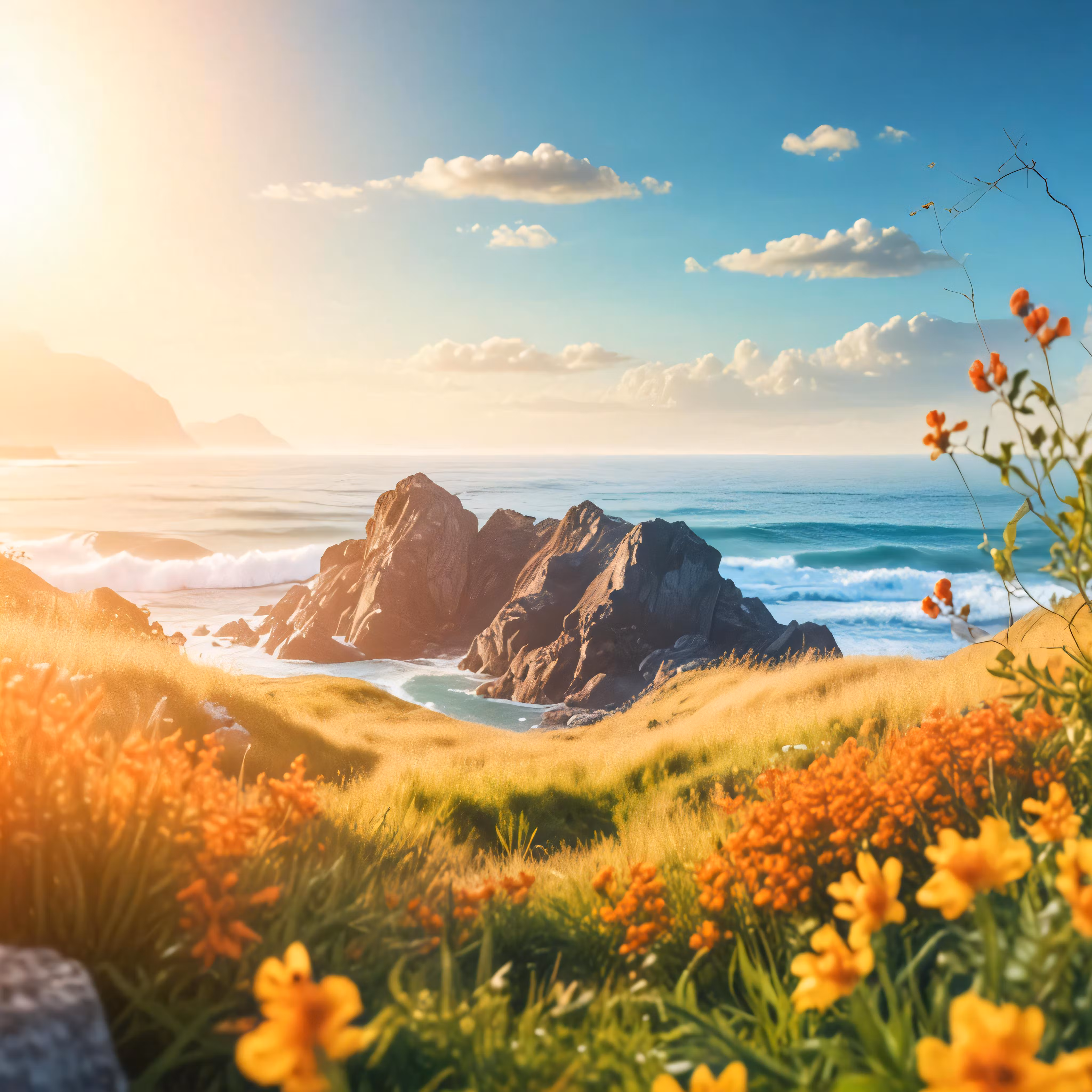 High resolution picture, free to use, the sun shining over the water off a rocky coast