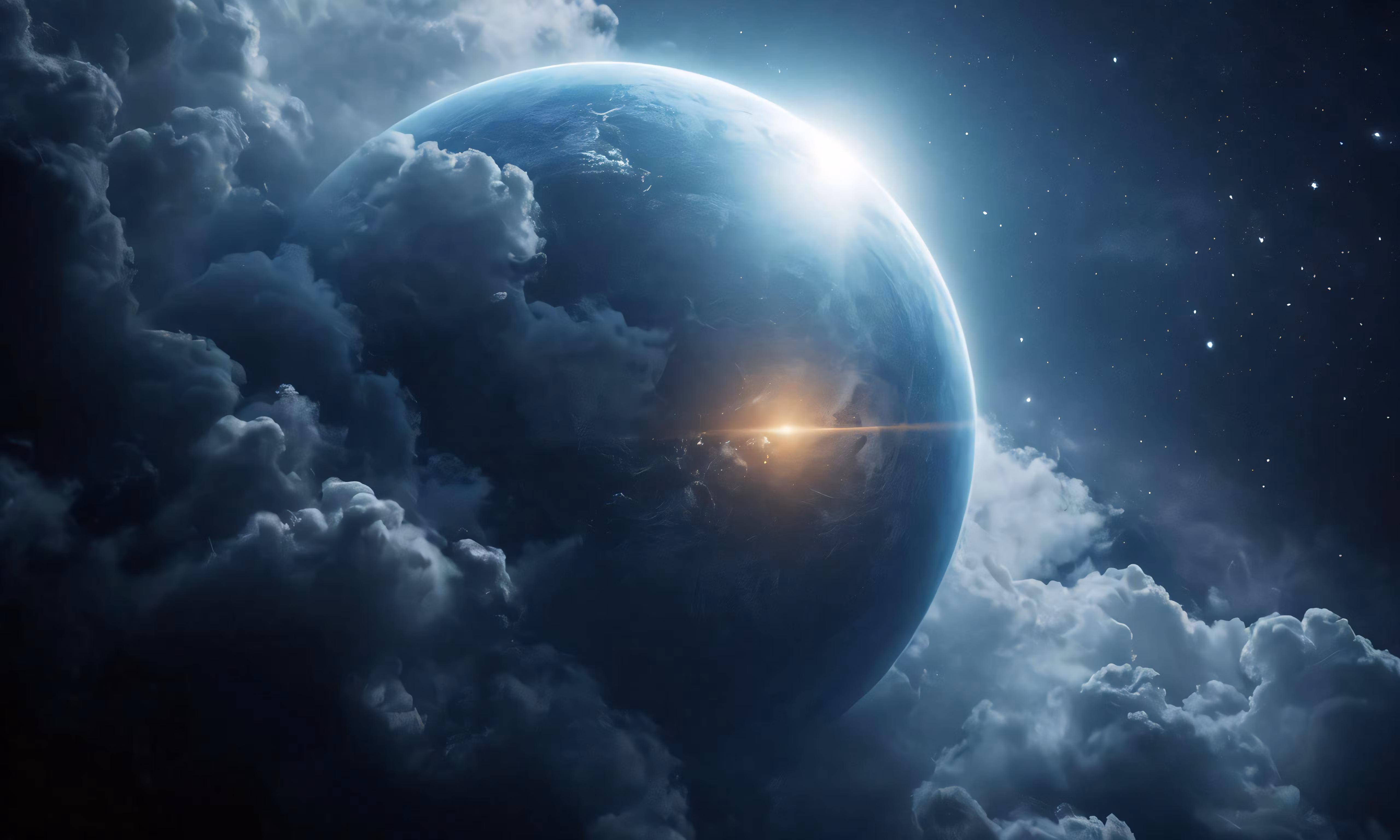 High resolution picture, free to use, the sun shining through clouds that surround the earth