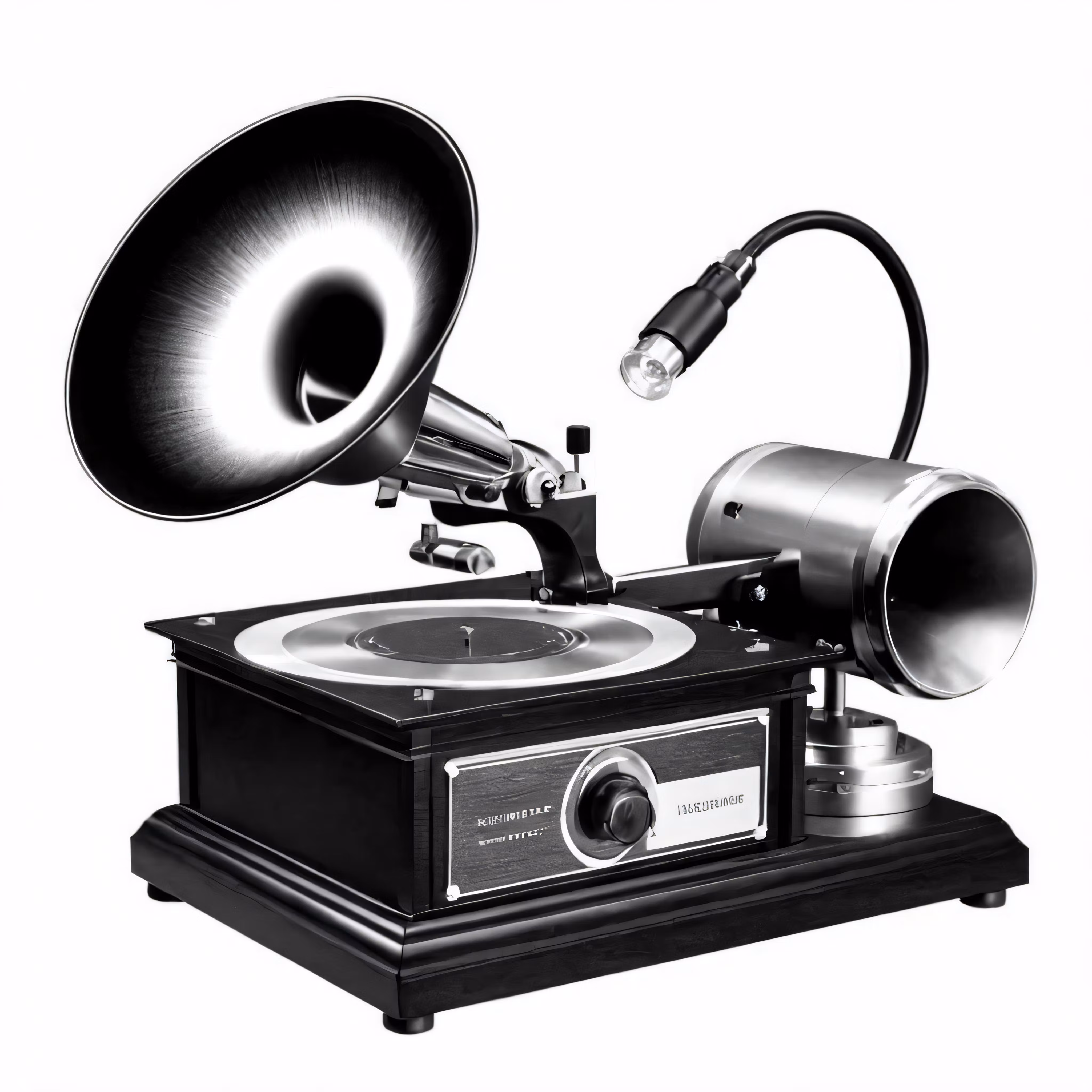 High resolution picture, free to use, the turntable is sitting on a small stand with a megaphone