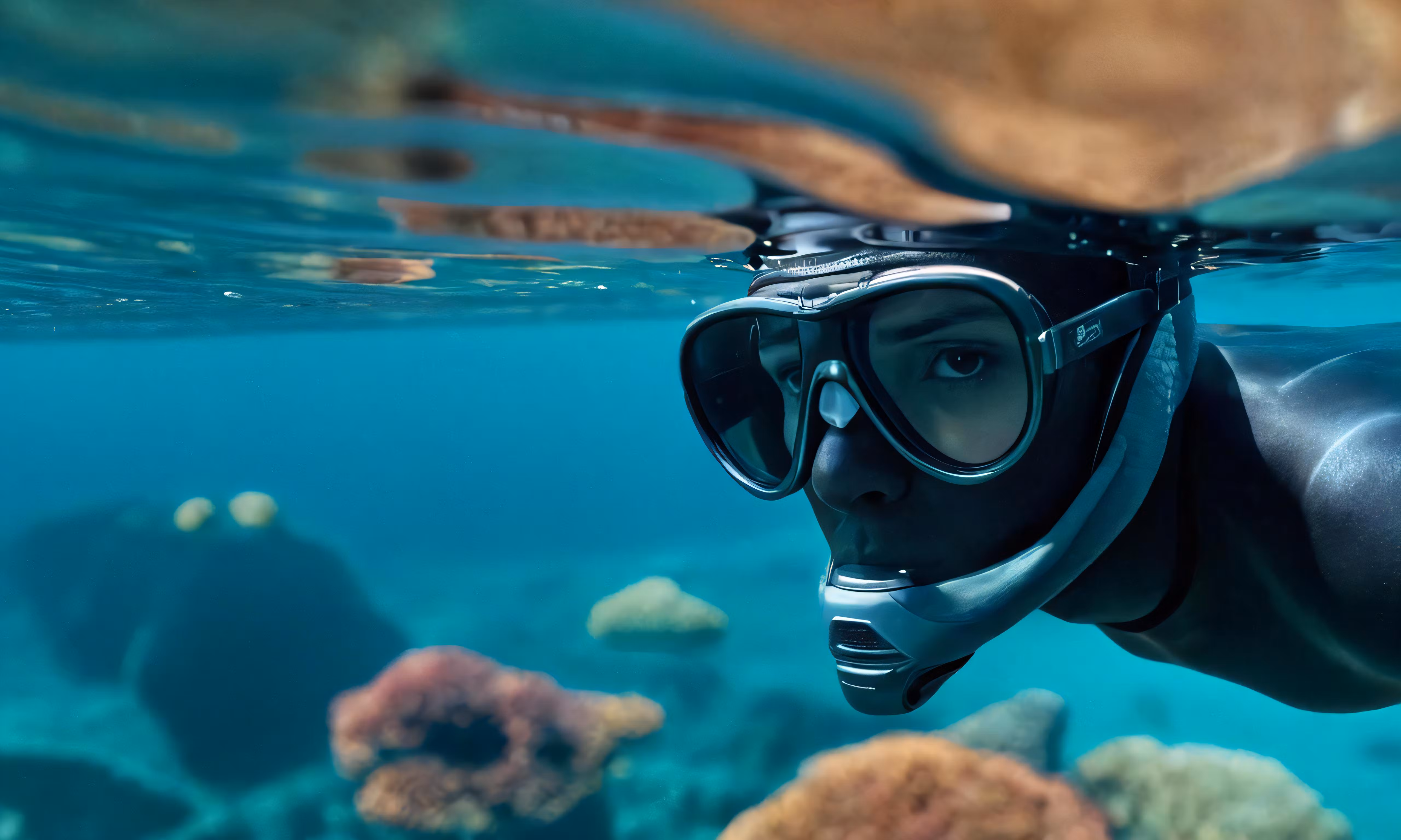 High resolution picture, free to use, the view from under water of a man wearing a diving gear