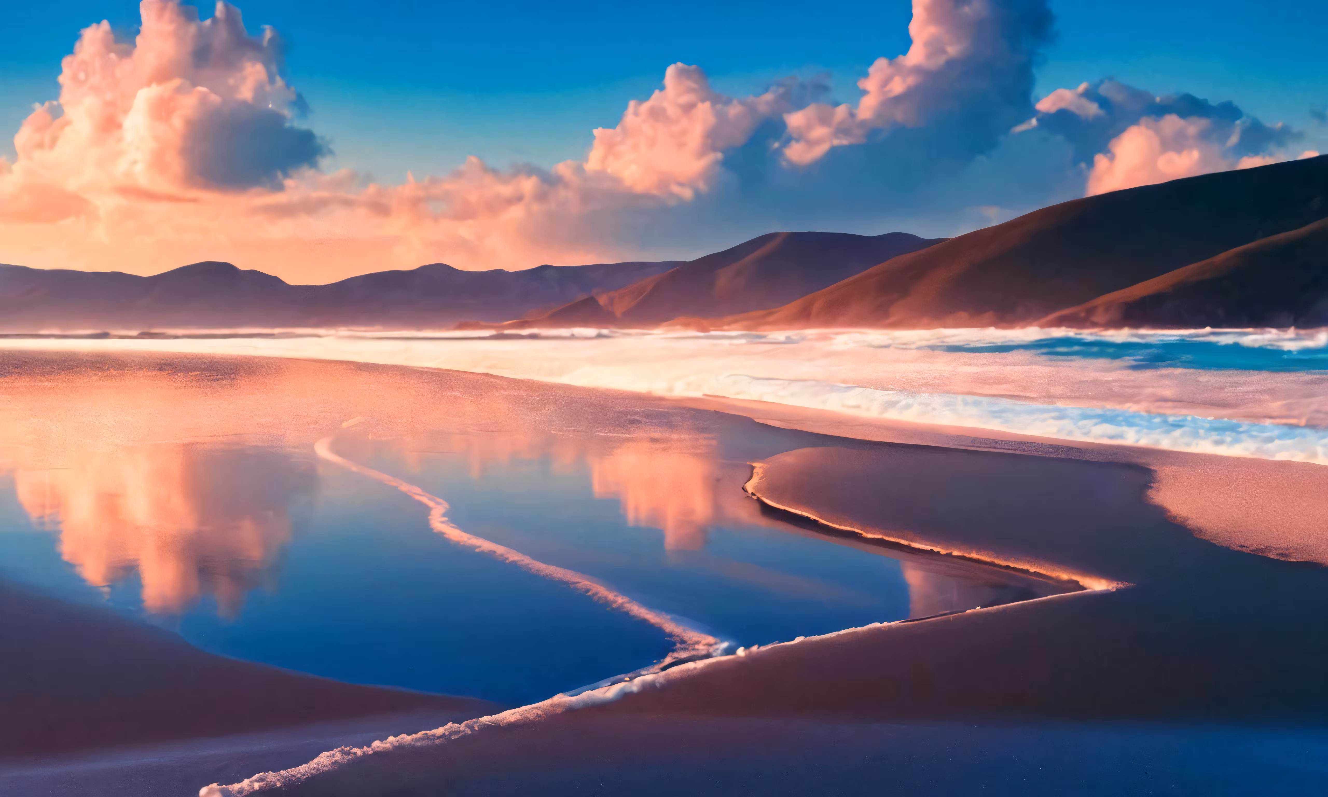 High resolution picture, free to use, the water has no waves but some pink clouds