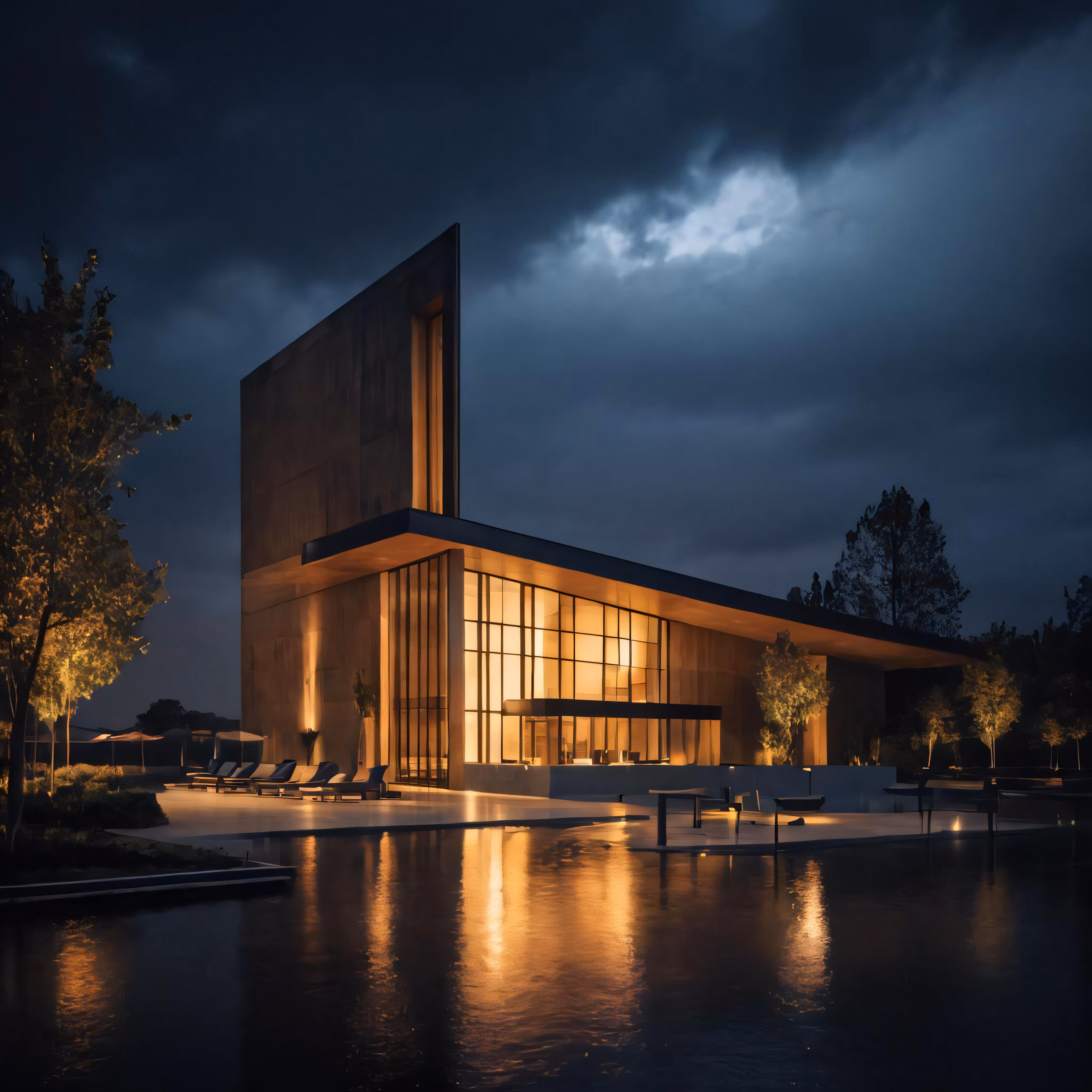 High resolution picture, free to use, the water reflects the lighting in front of a building