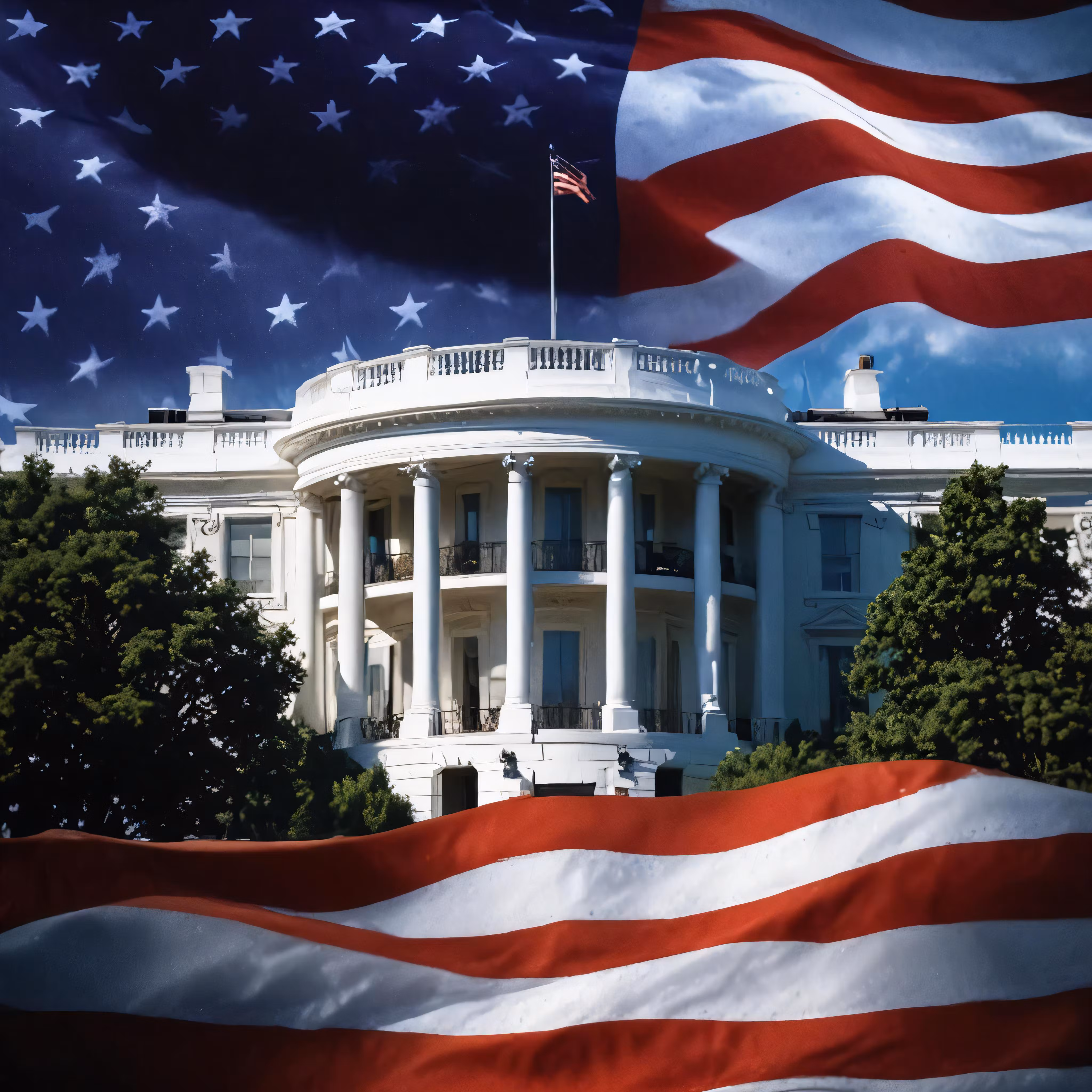 High resolution picture, free to use, the white house with a giant american flag in the foreground