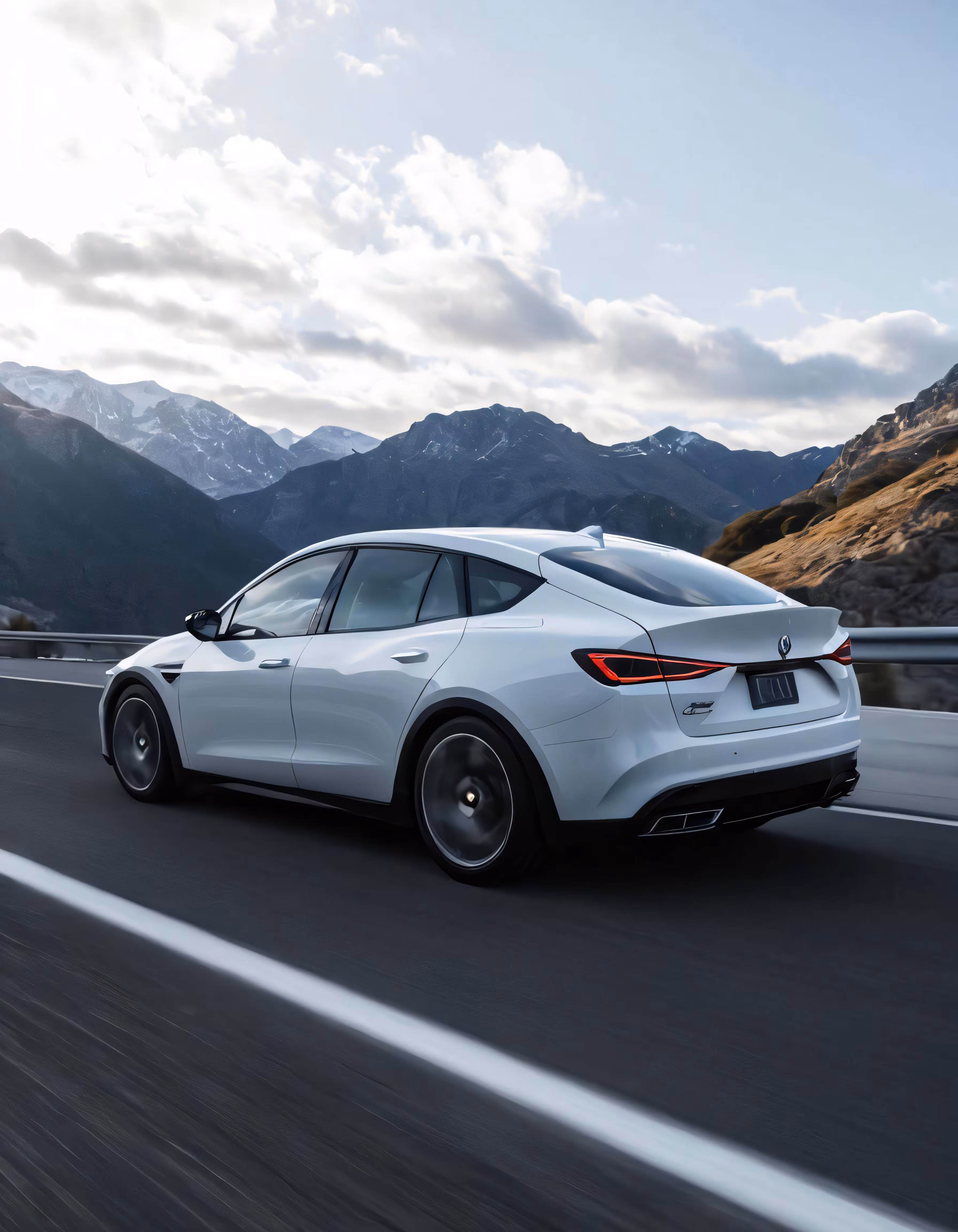 High resolution picture, free to use, the white sports car driving on a highway with mountains in the distance