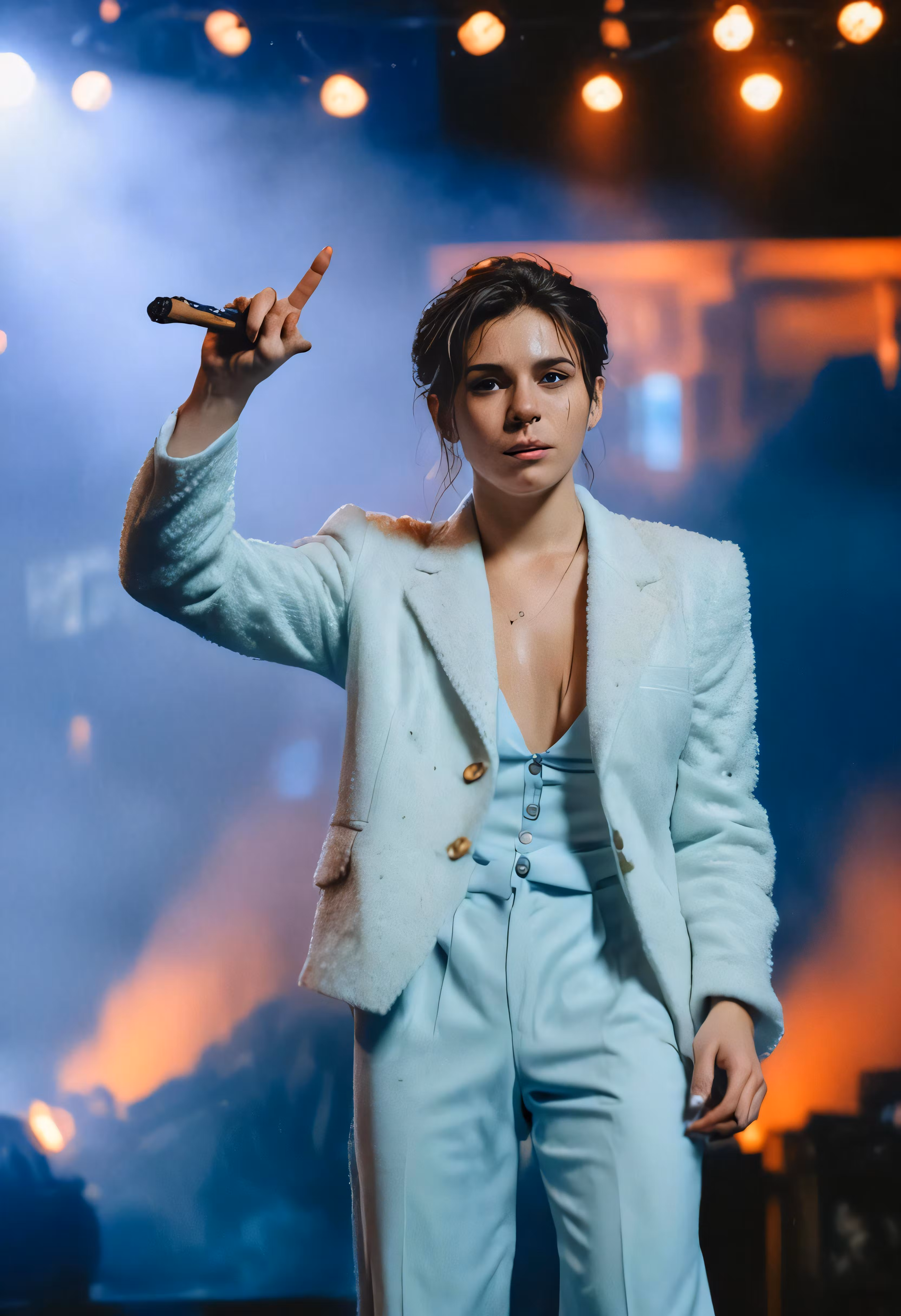 High resolution picture, free to use, the woman in a light blue suit holding up a cigarette