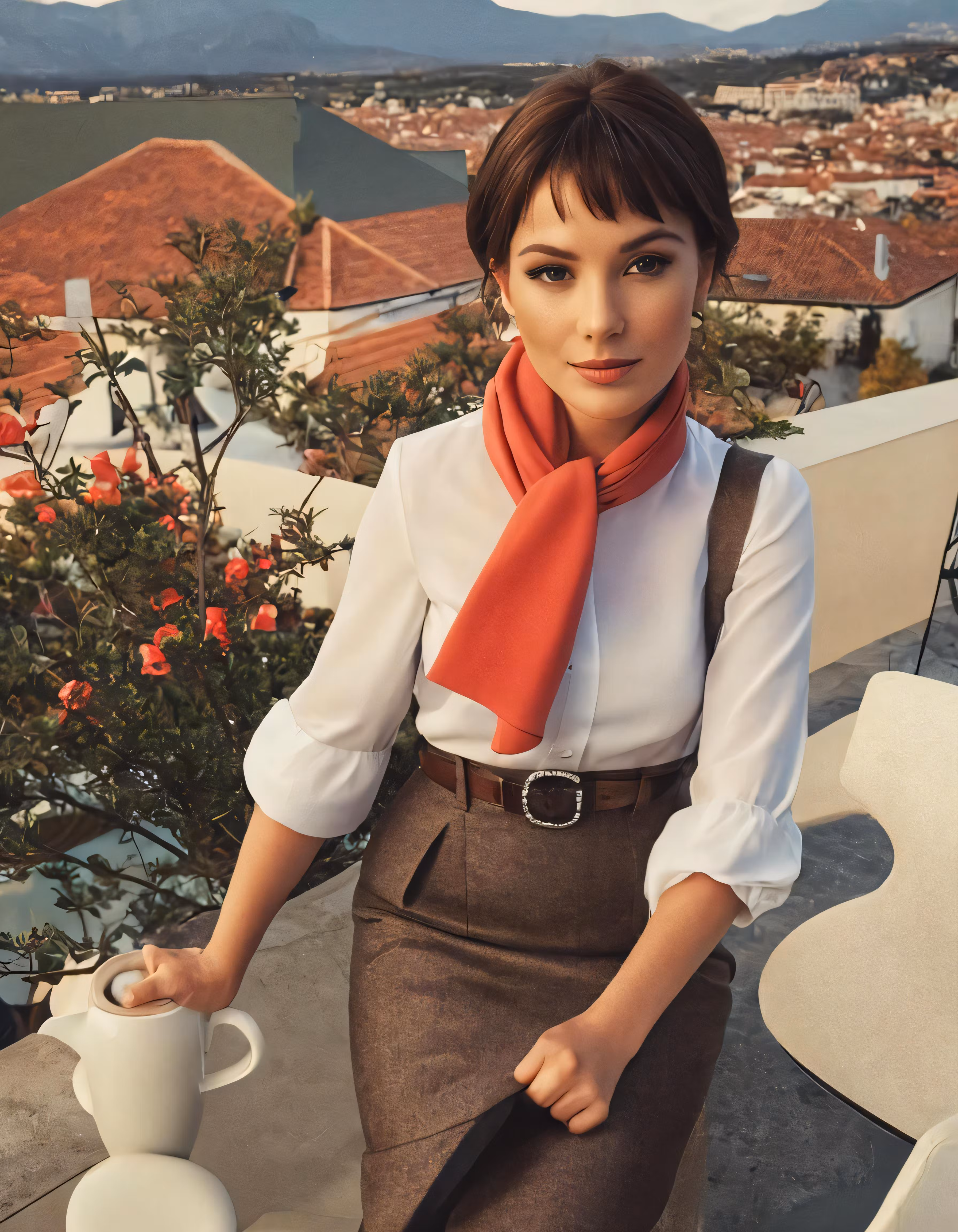 High resolution picture, free to use, the woman in brown skirt is carrying a cup and umbrella