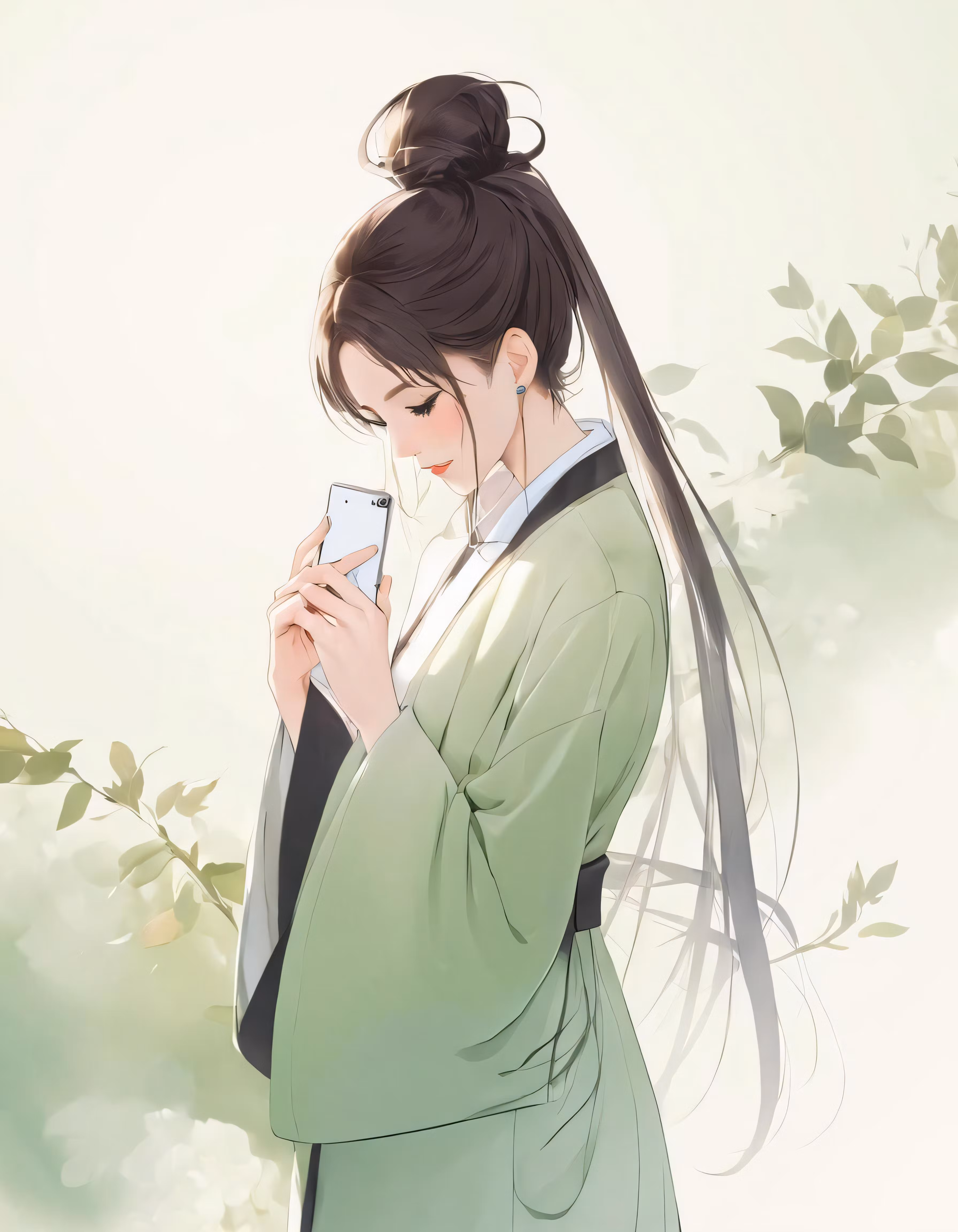 High resolution picture, free to use, the woman in green is holding her cell phone