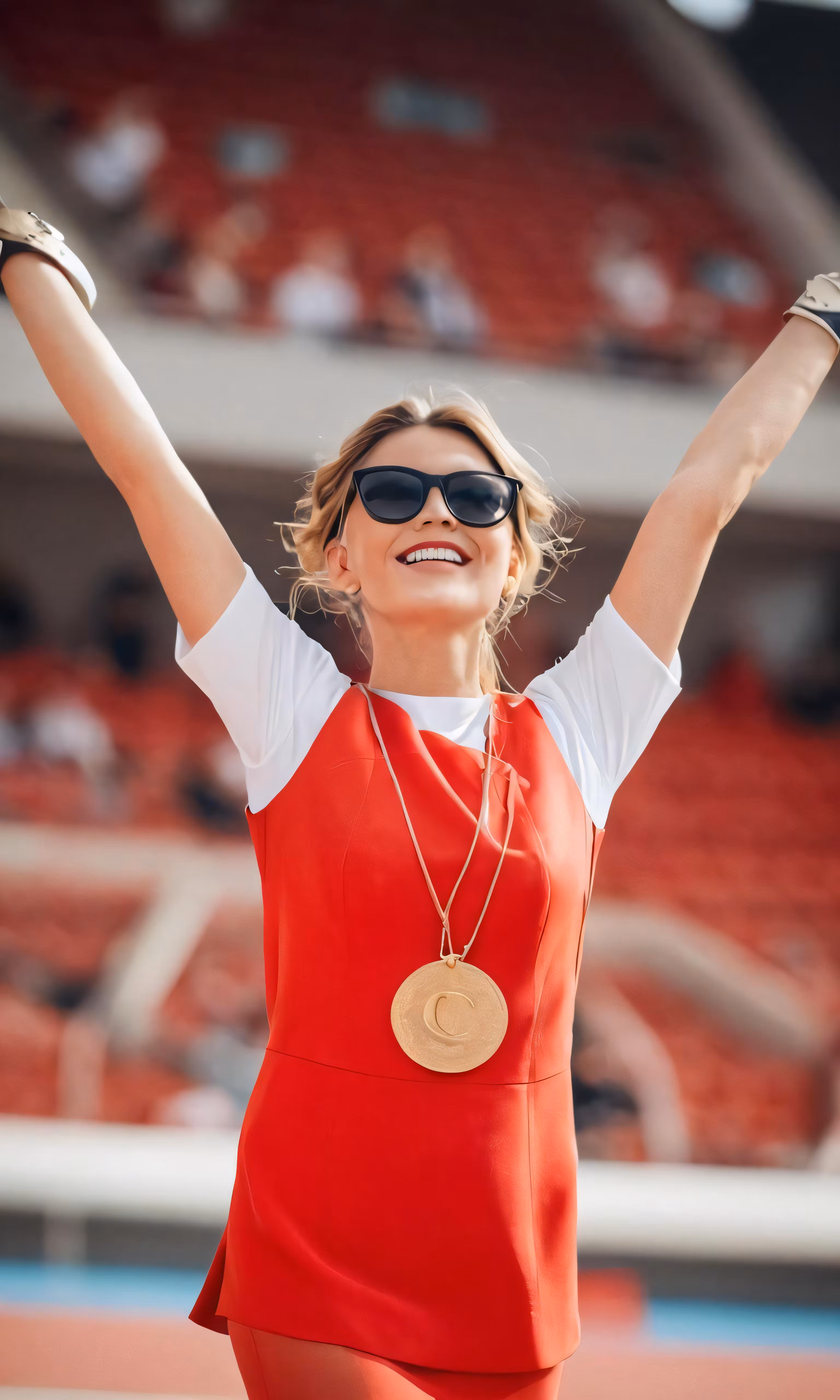 High resolution picture, free to use, the woman in the red and white outfit is wearing sun glasses