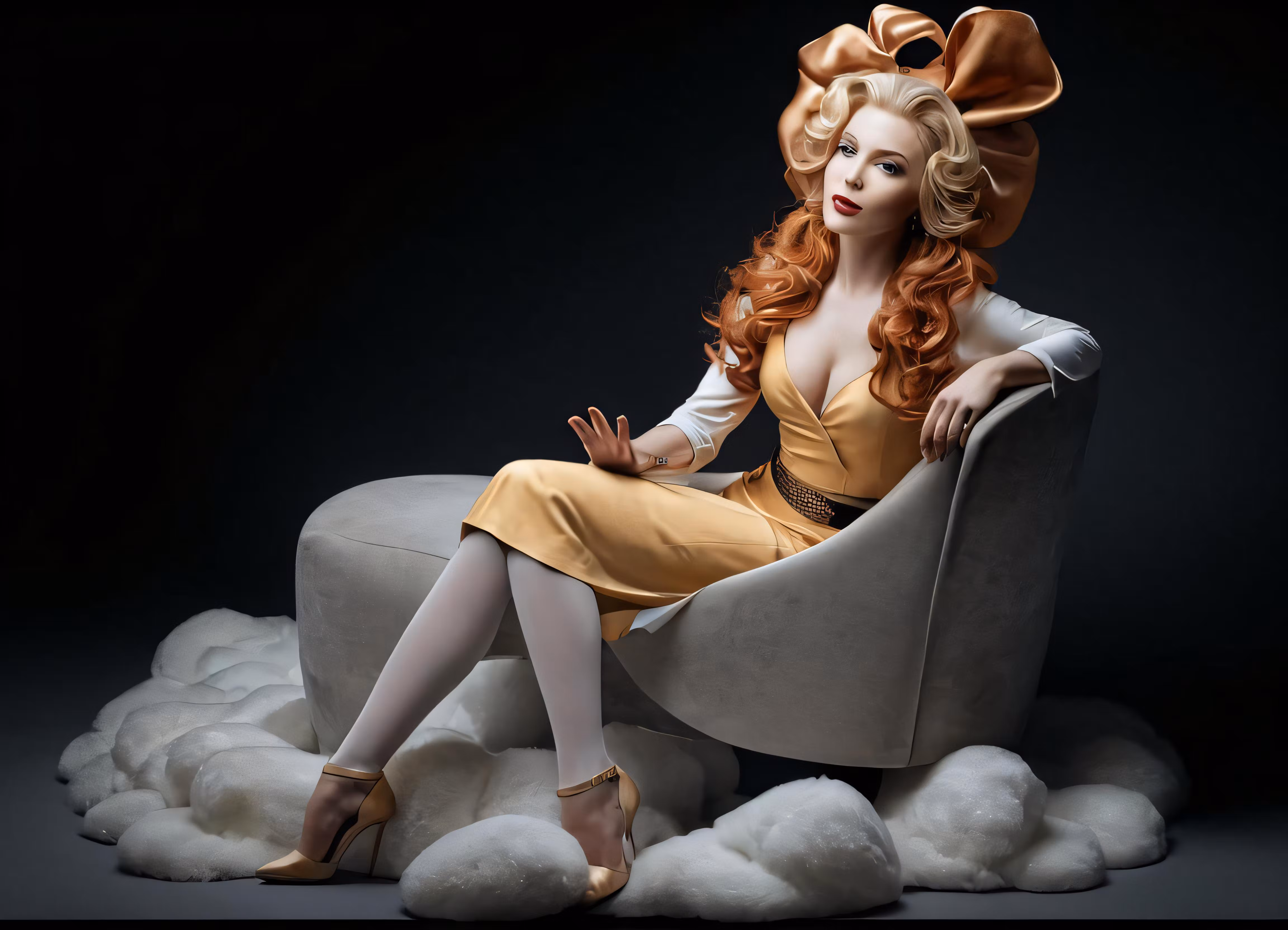 High resolution picture, free to use, the woman in the yellow dress is sitting on a gray chair