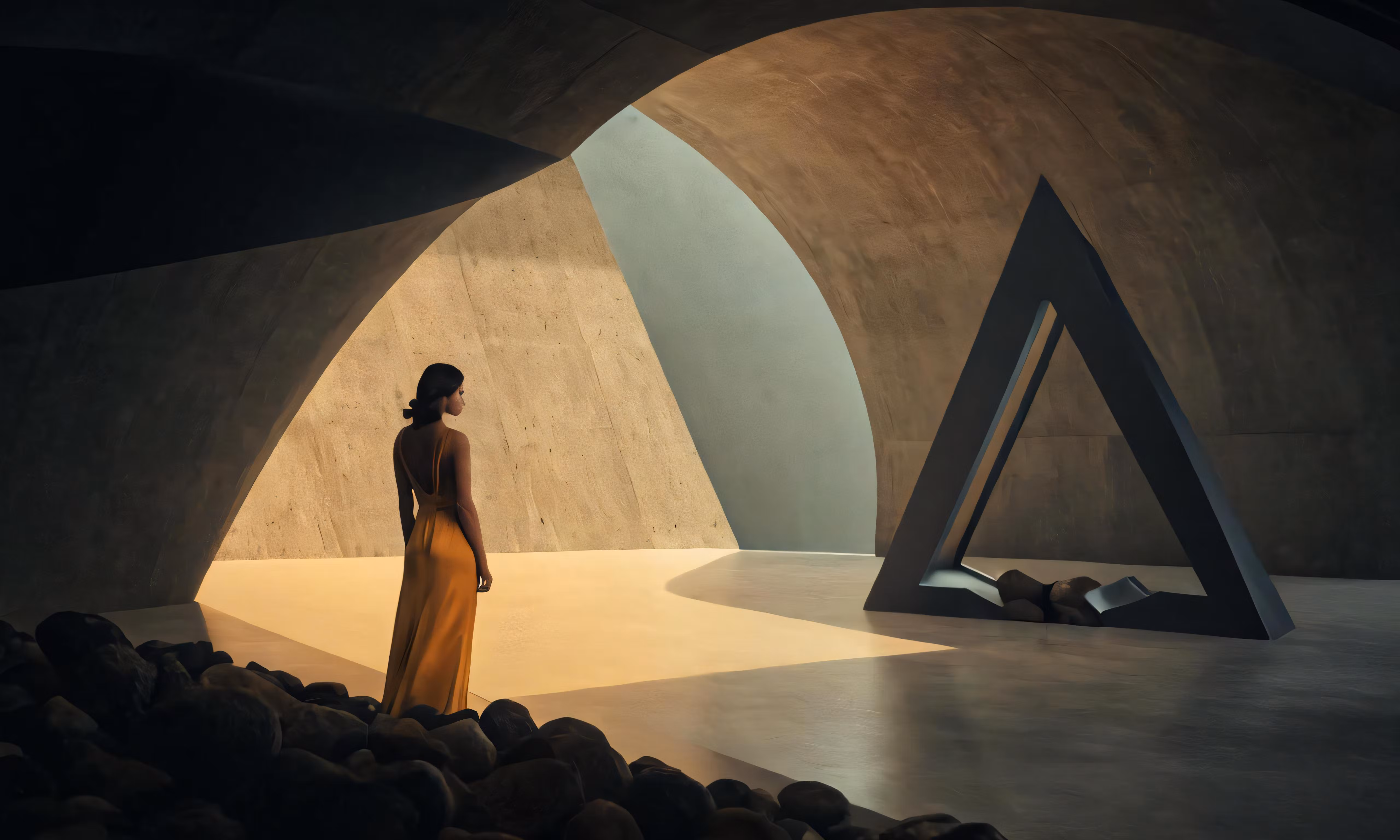 High resolution picture, free to use, the woman in yellow dress stands near two large structures