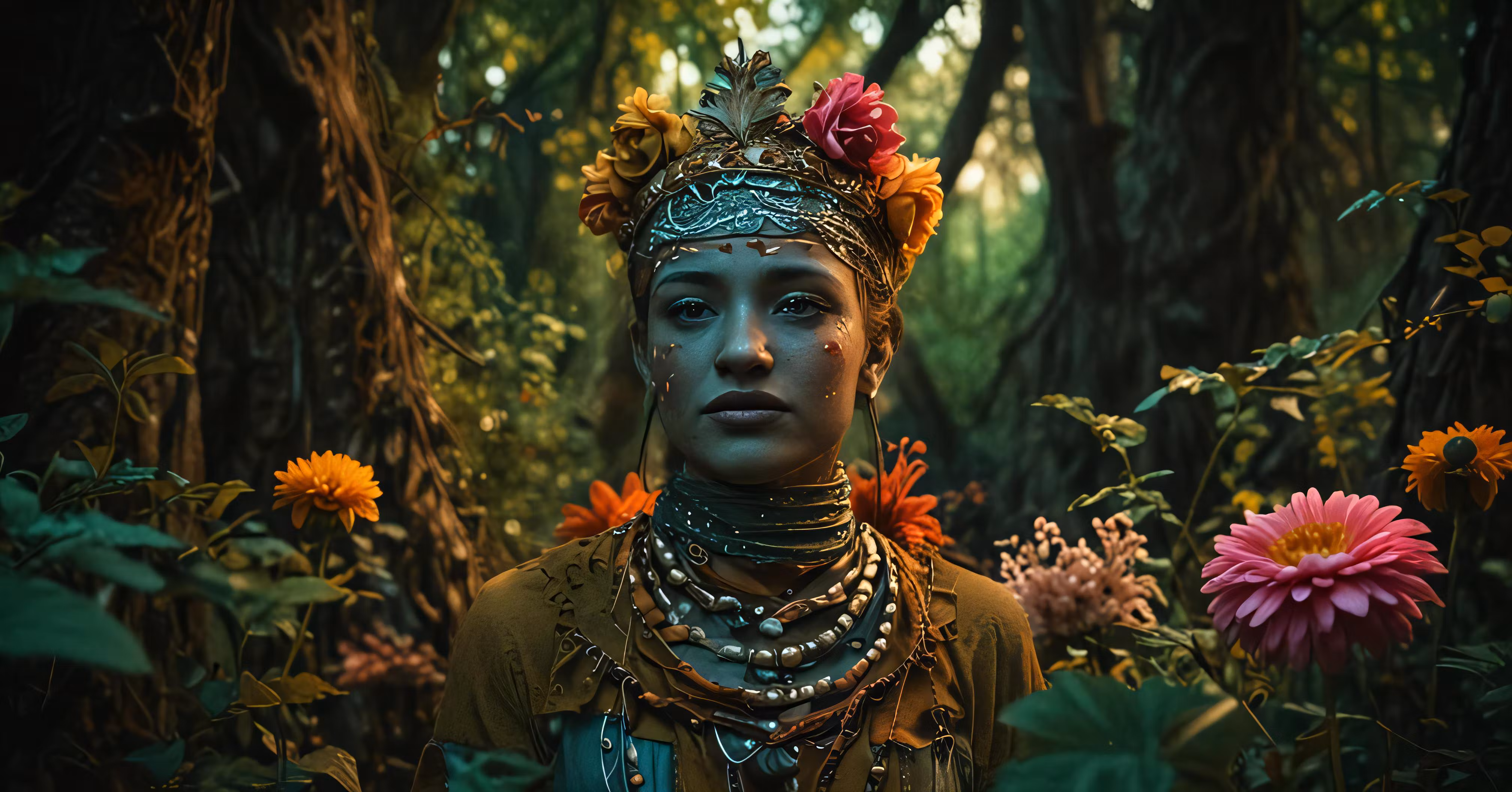 High resolution picture, free to use, the woman is dressed in an elaborate necklace, collar, and headpiece