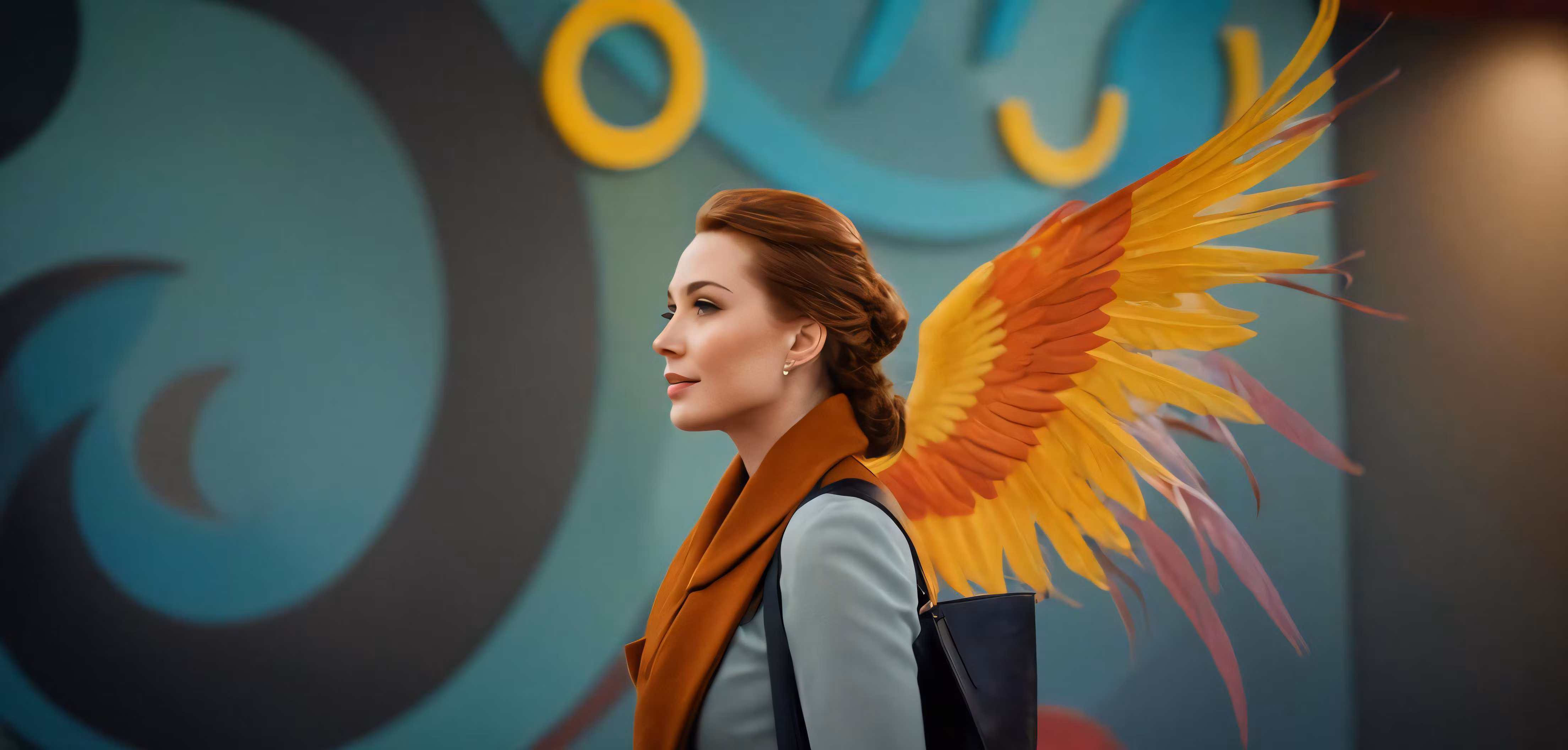 High resolution picture, free to use, the woman is dressed in blue and white with orange wings