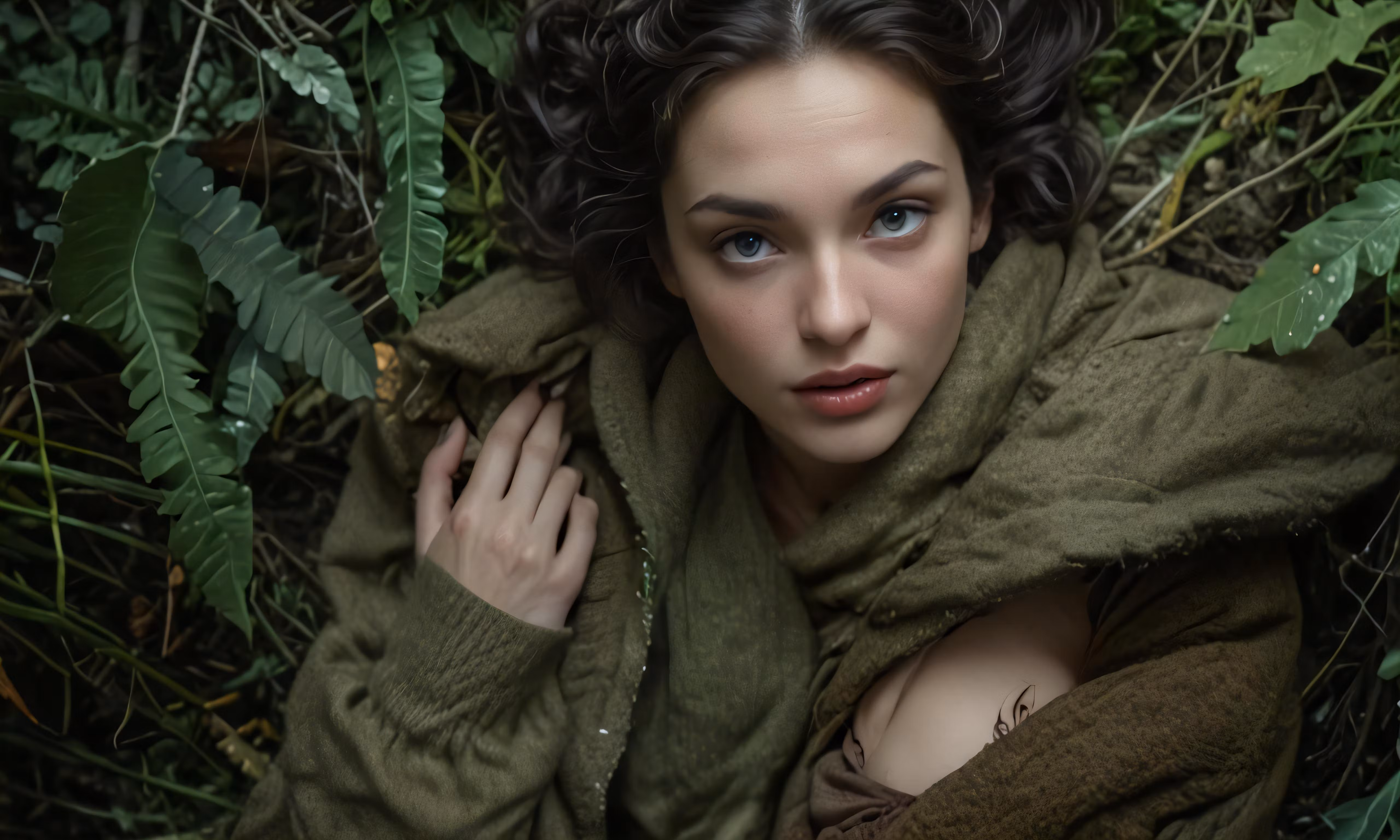 High resolution picture, free to use, the woman is hiding in the ferns under a blanket