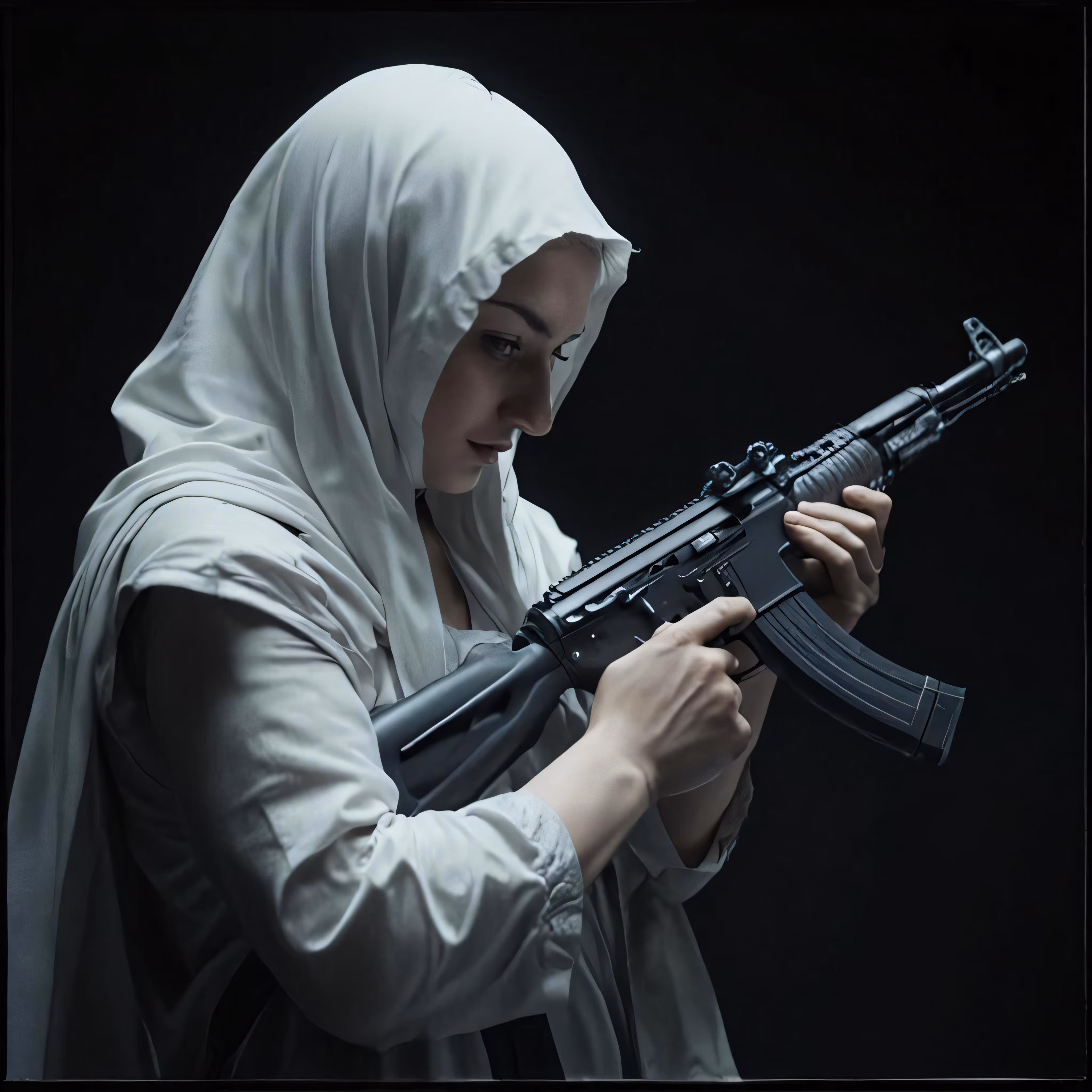 High resolution picture, free to use, the woman is holding the rifle and looking at it