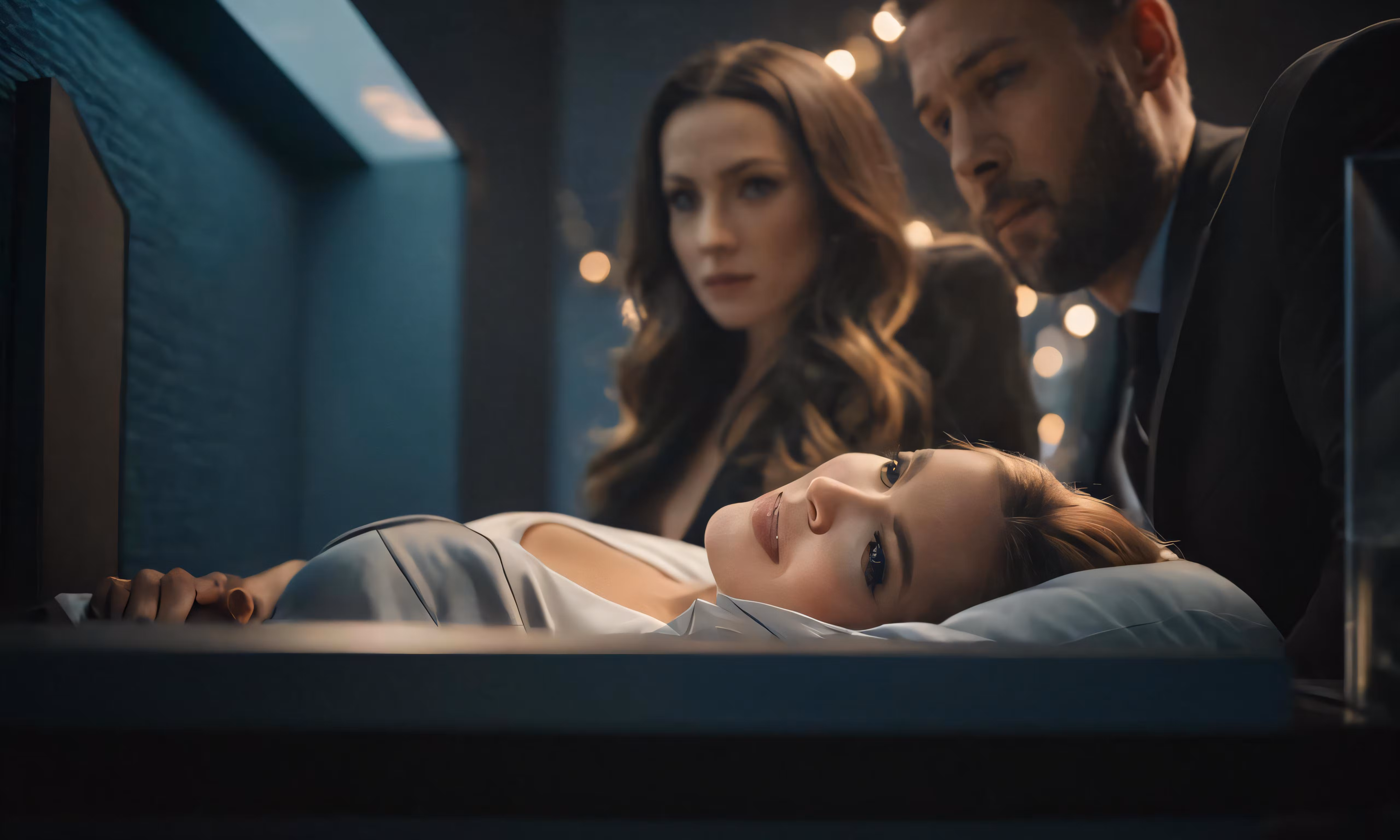 High resolution picture, free to use, the woman is laying down on her bed and man looks on